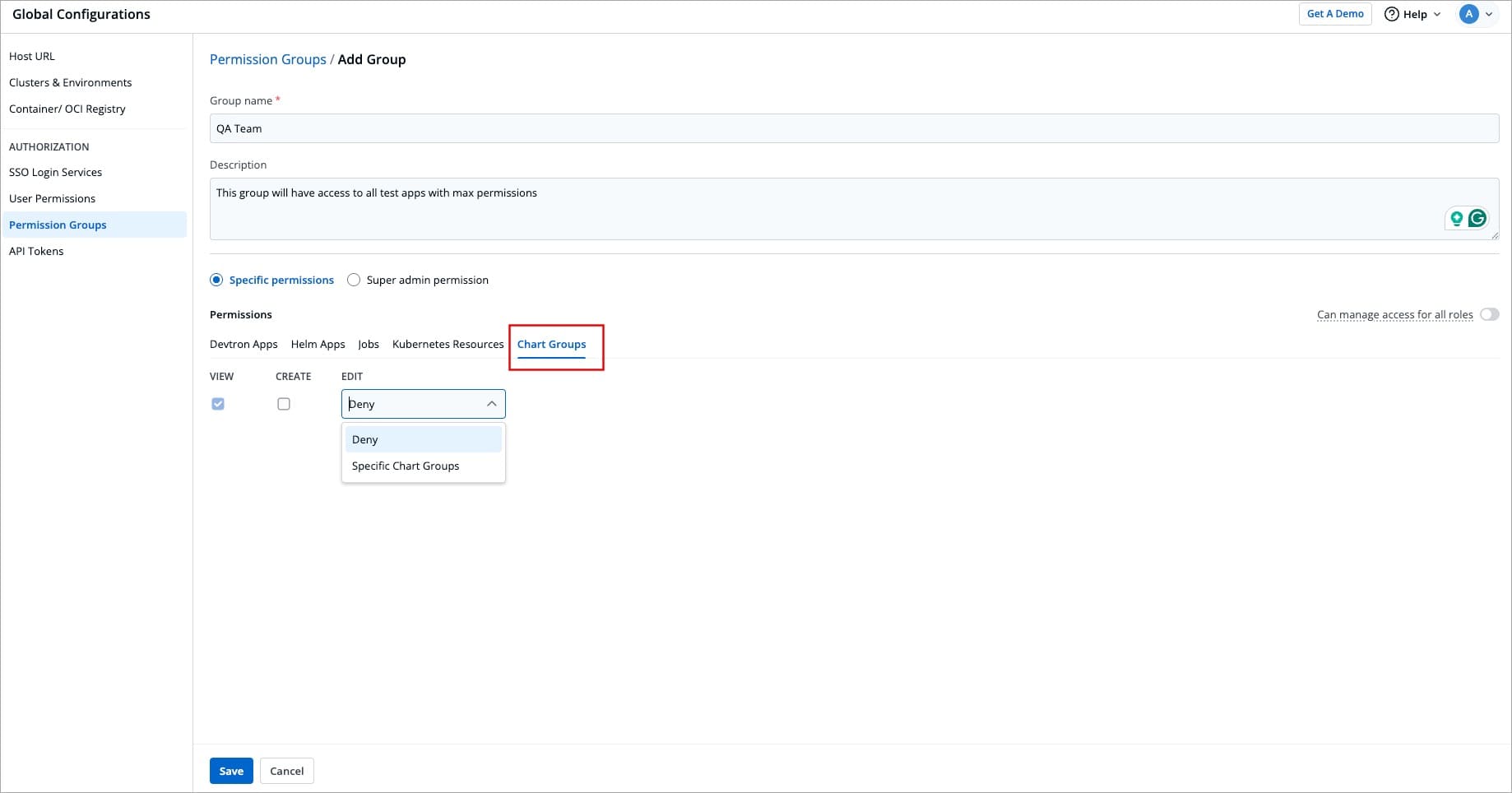 In Chart group permission option, you can manage the access of groups for Chart Groups in your project.