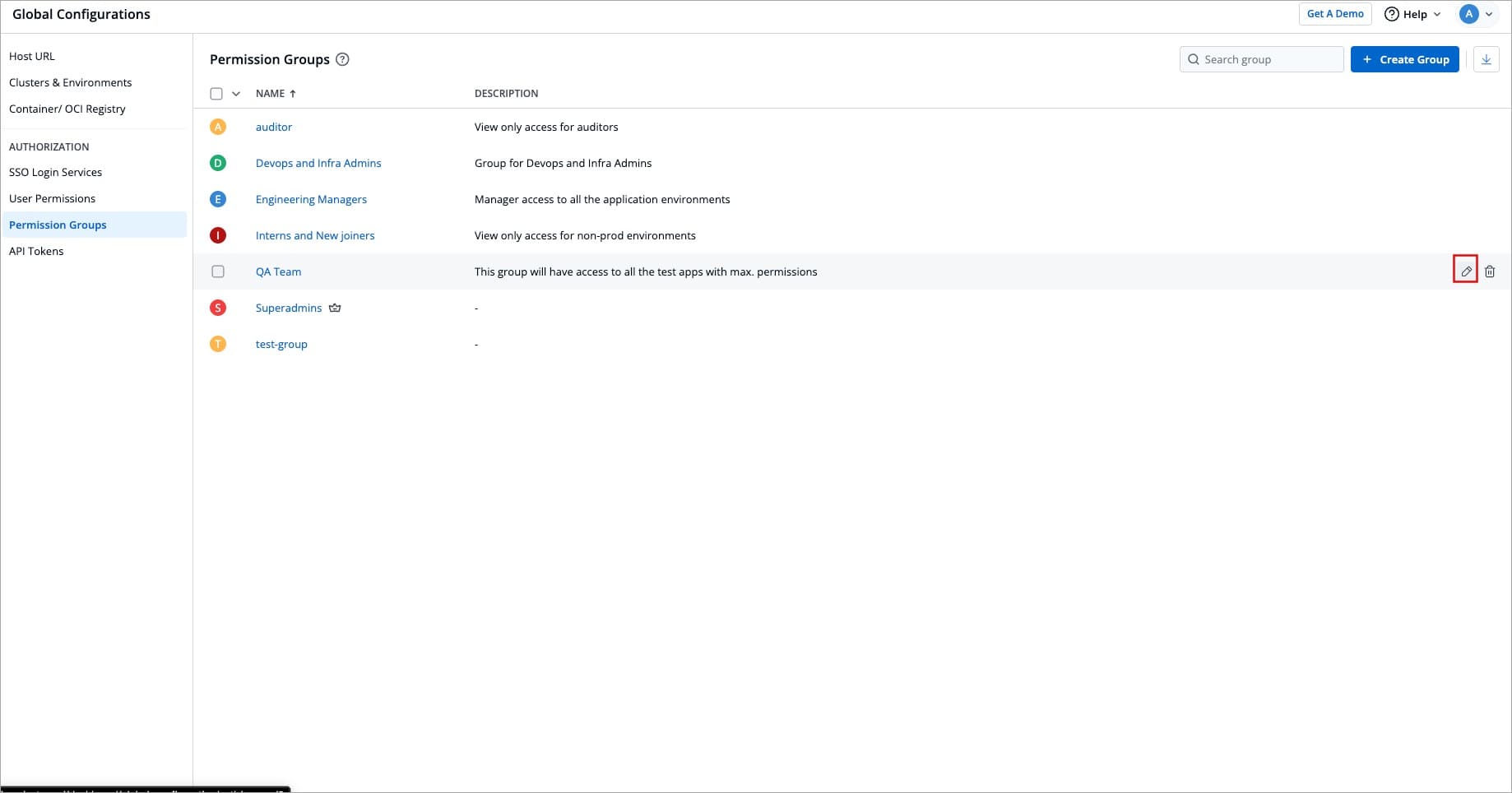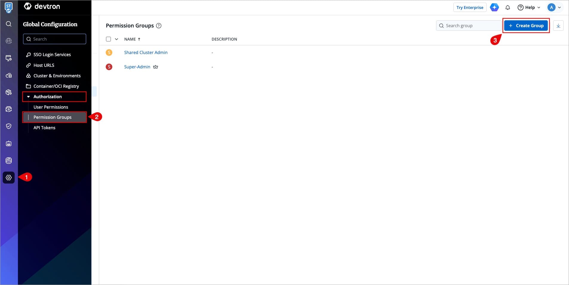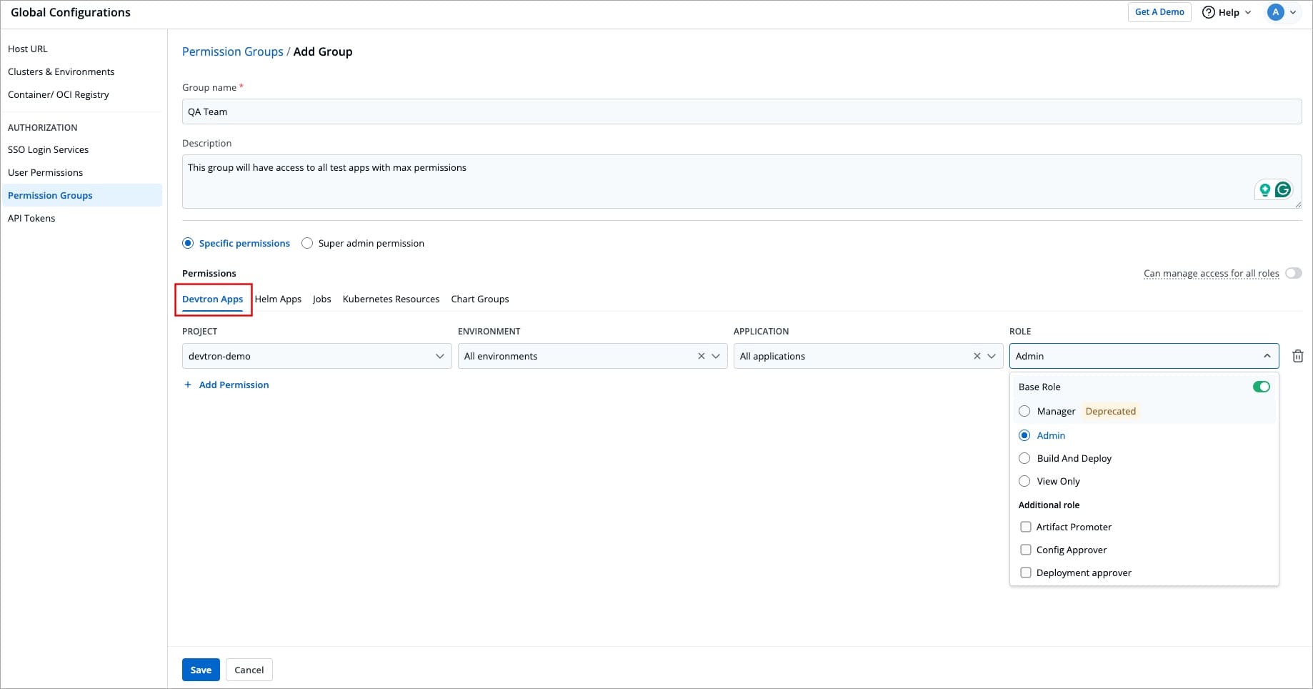 In Devtron Apps option, you can provide access to a group to manage permission for custom apps created using Devtron.