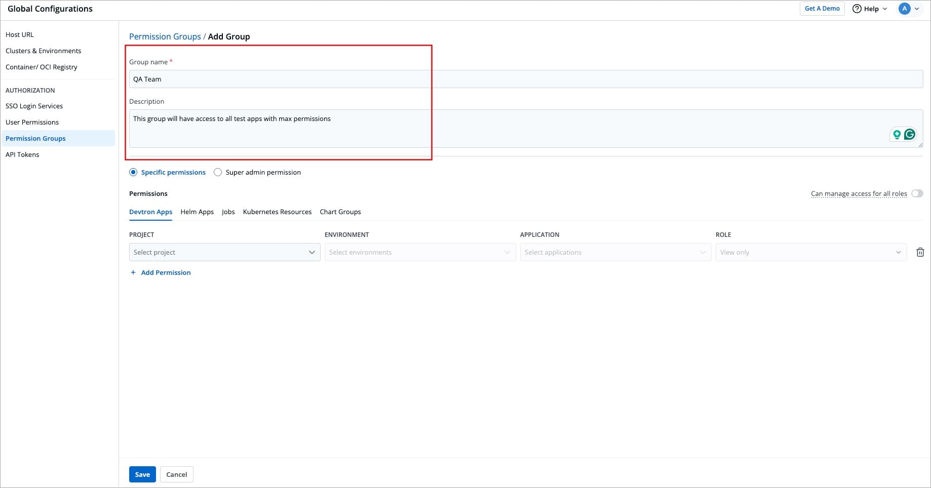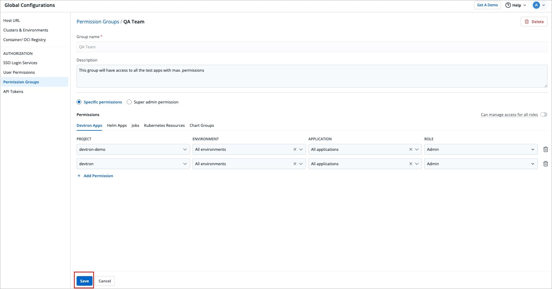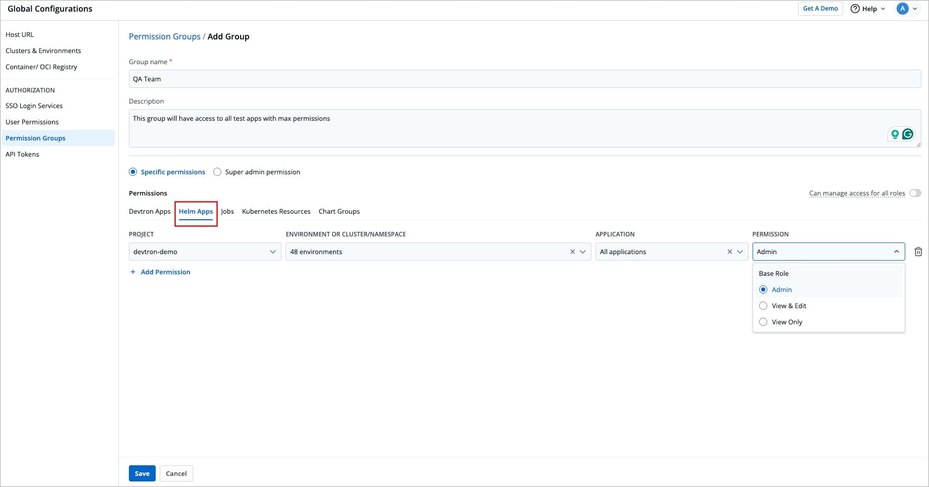 In Helm Apps option, you can provide access to a group to manage permission for Helm apps deployed from Devtron or outside Devtron.