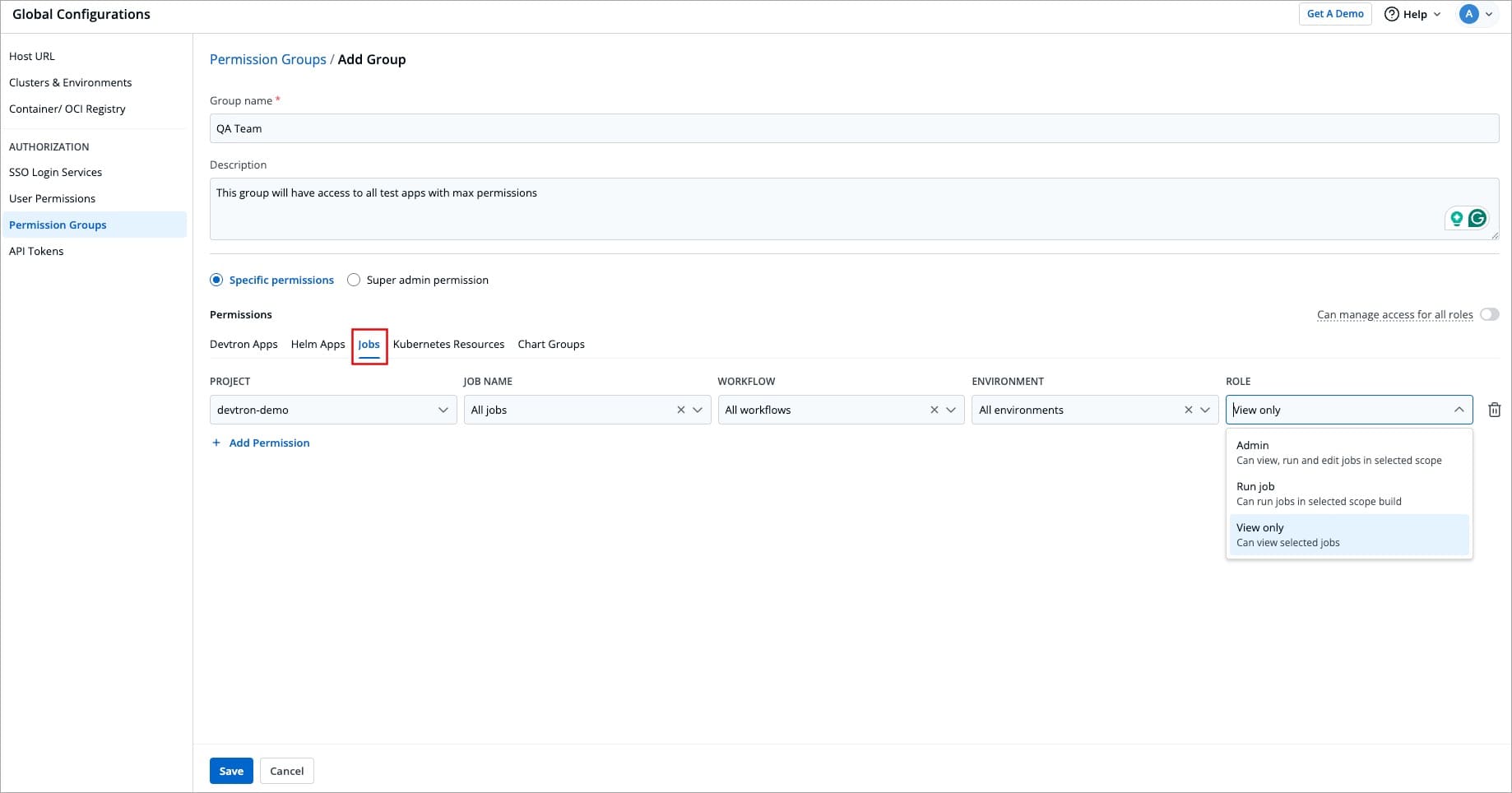 In Jobs option, you can provide access to a group to manage permission for jobs created using Devtron.