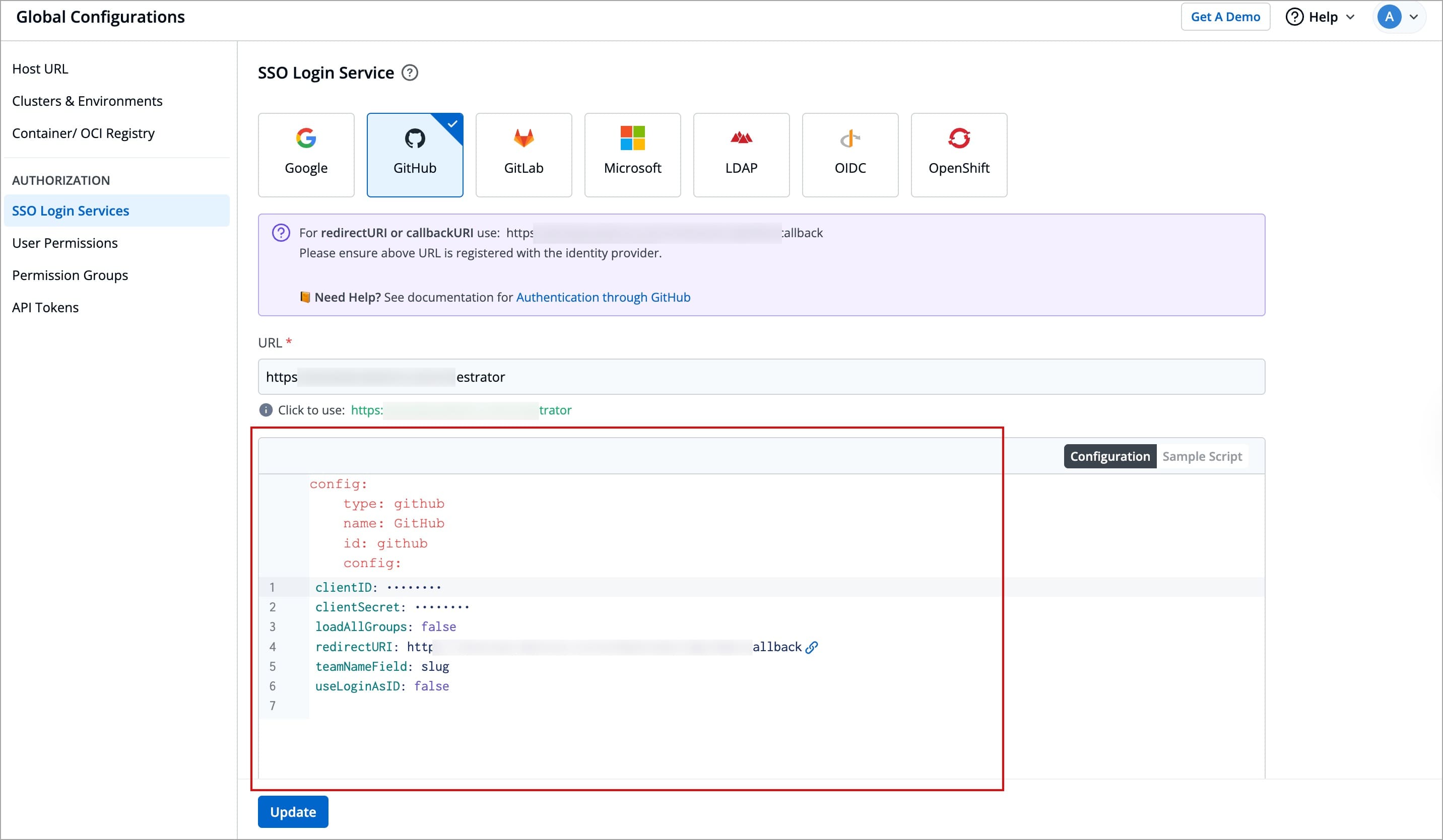 Click Update to save the configuration. GitHub SSO is now successfully configured.