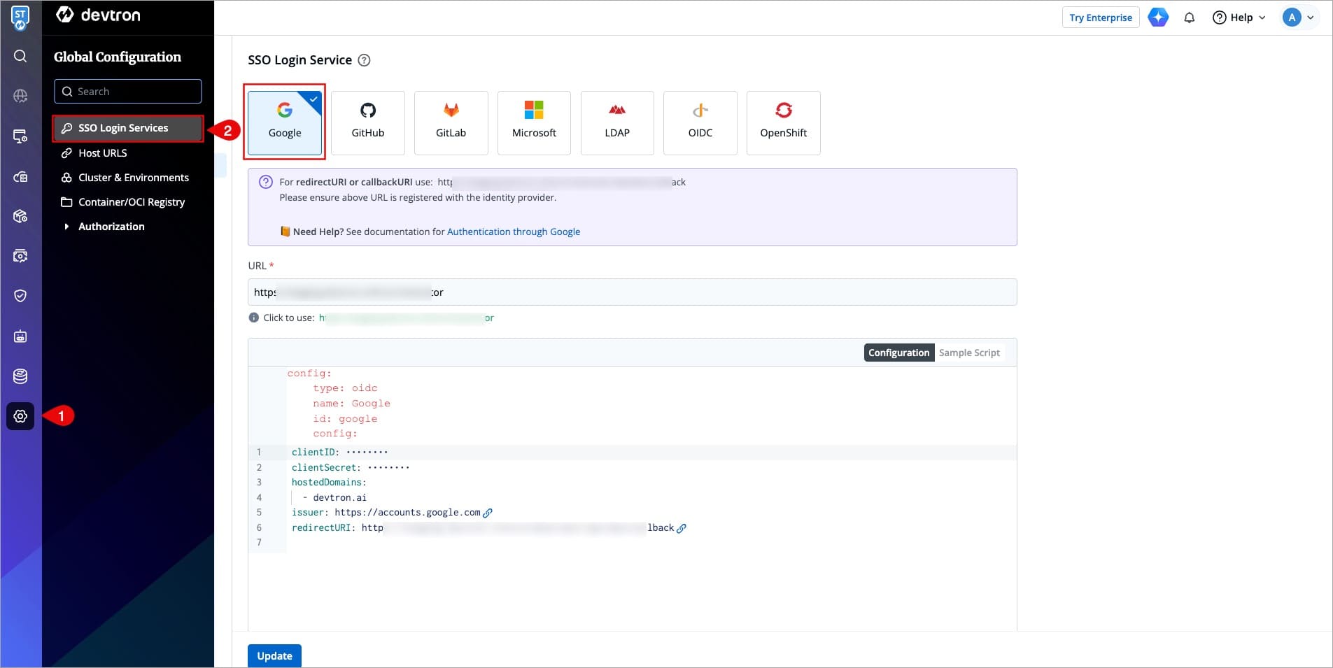 Ensure that the Host URL is correctly configured in Devtron. This is crucial because the Redirect URI is generated based on the Host URL.