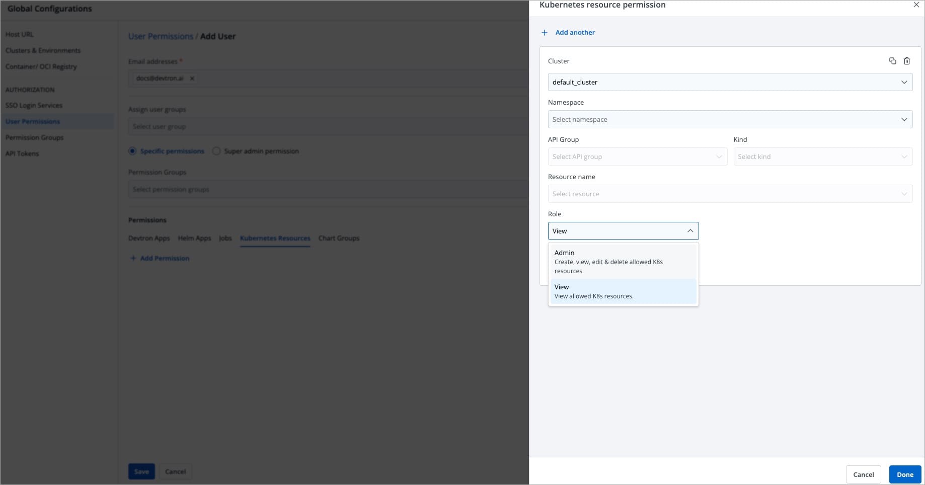 | Cluster | Select a cluster from the dropdown list to which you want to give permission to the user. You can select only one cluster at a time. Note: To add another cluster, click Add another. |