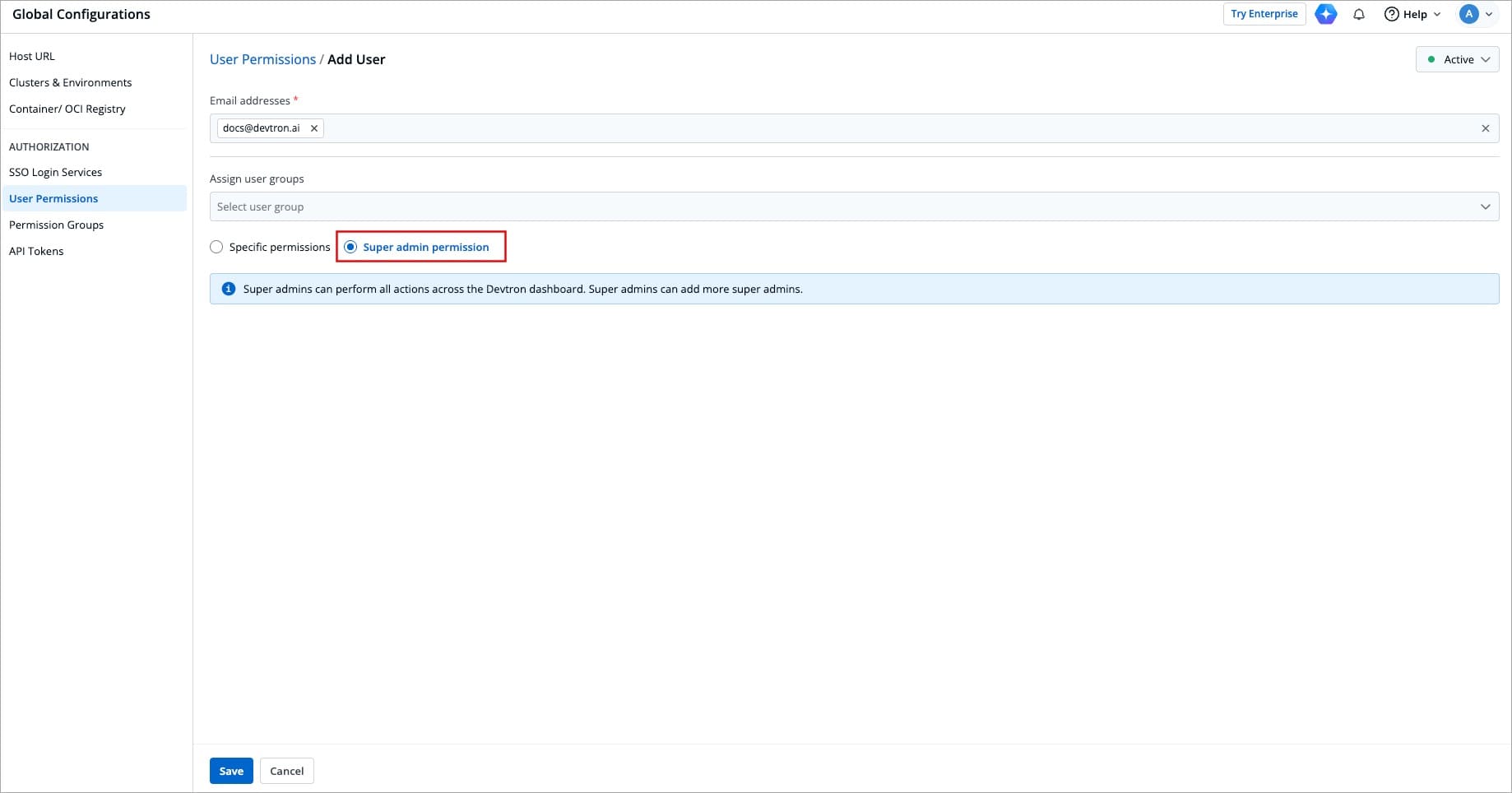 Super-Admins have unrestricted access to all Devtron resources. They can create, modify, delete, and manage any resource, including user access, Git repositories, container registries, clusters, and environments. Before assigning this permission, please note: