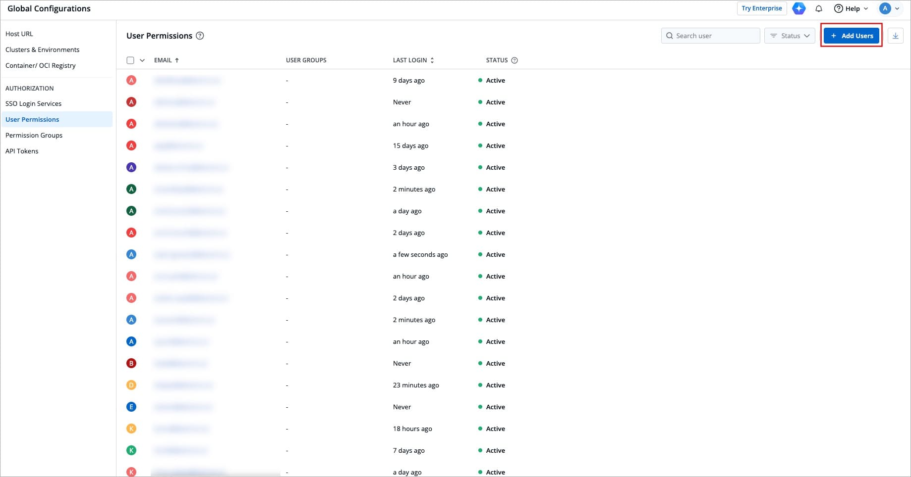 Here you can manage who can access your Devtron instance and what actions they can perform. Use this section to add team members, assign them roles, and control their access by granting fine-grained permissions. Moreover, you can also download all user data in a CSV format.