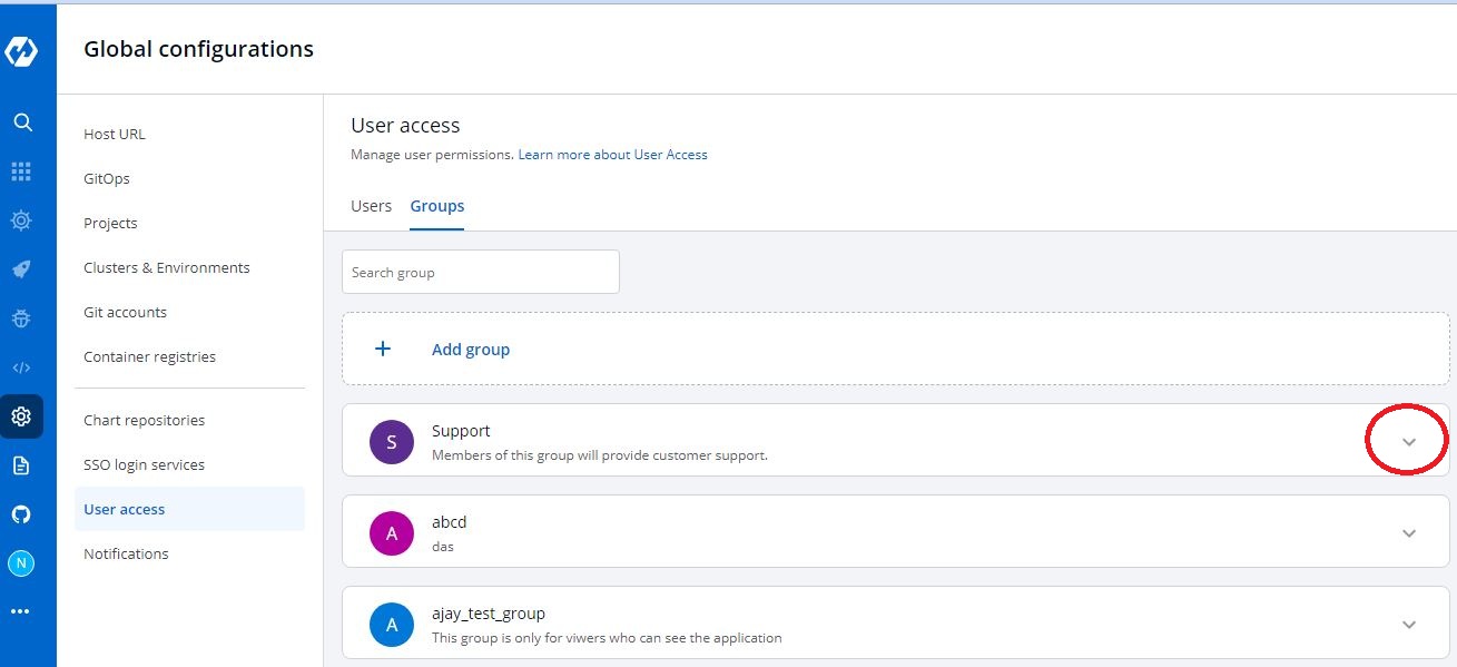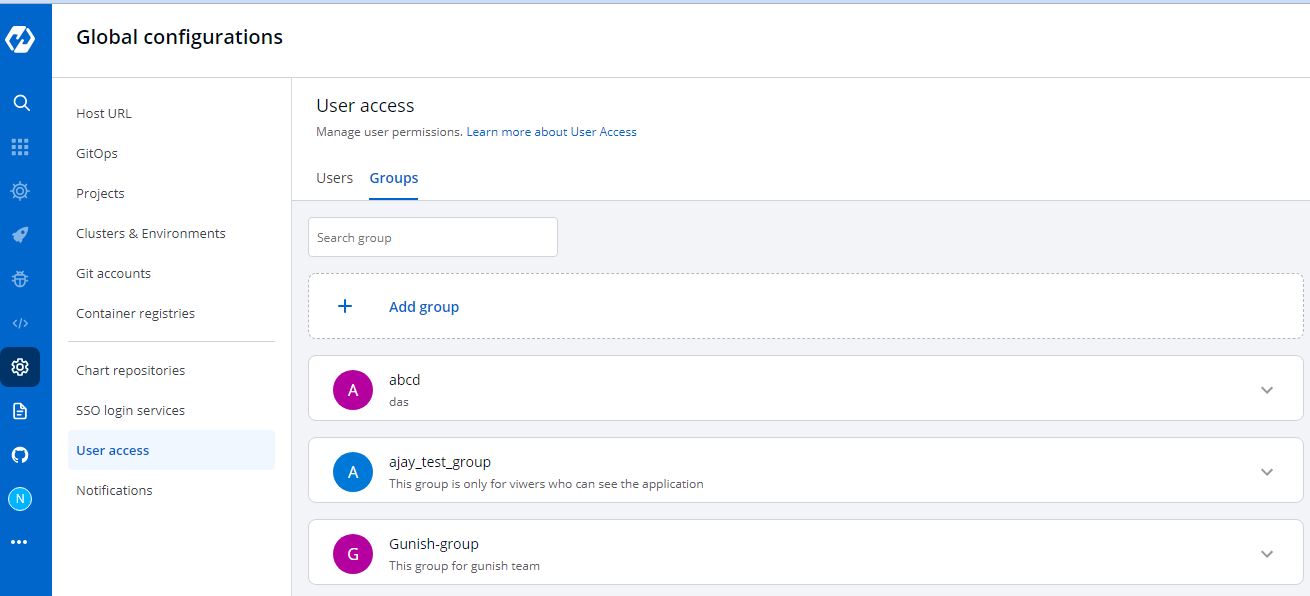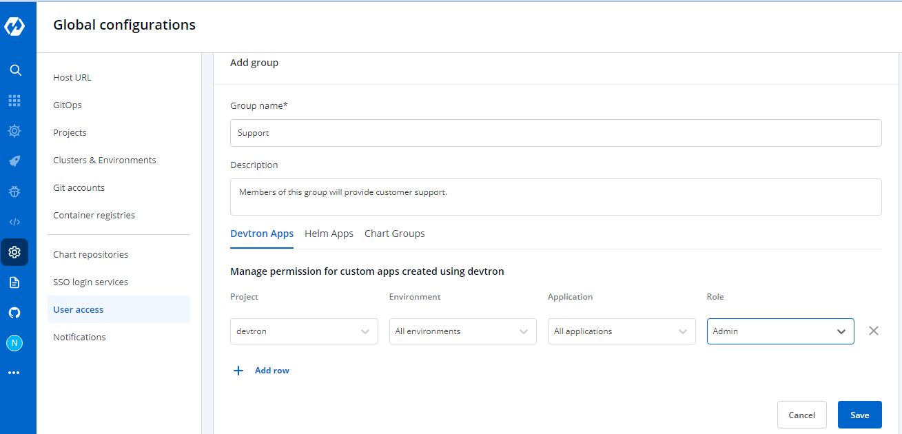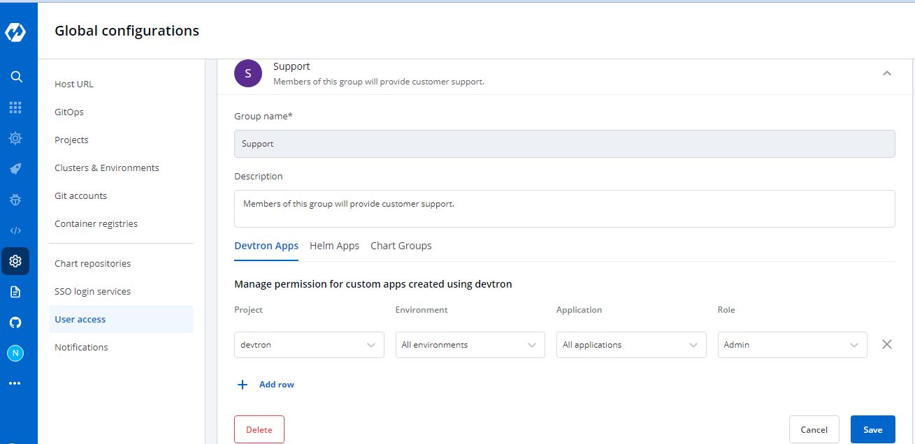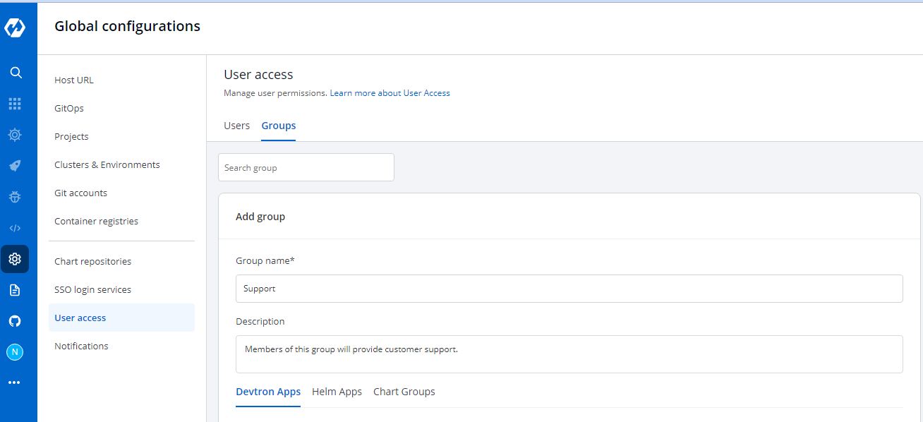 Then, control the access permissions of groups in the Devtron Apps, Helm Apps or Group Chart Permissions section. Manage the Project, Environment, Application, and Role access the same as we discuss in the above users section.