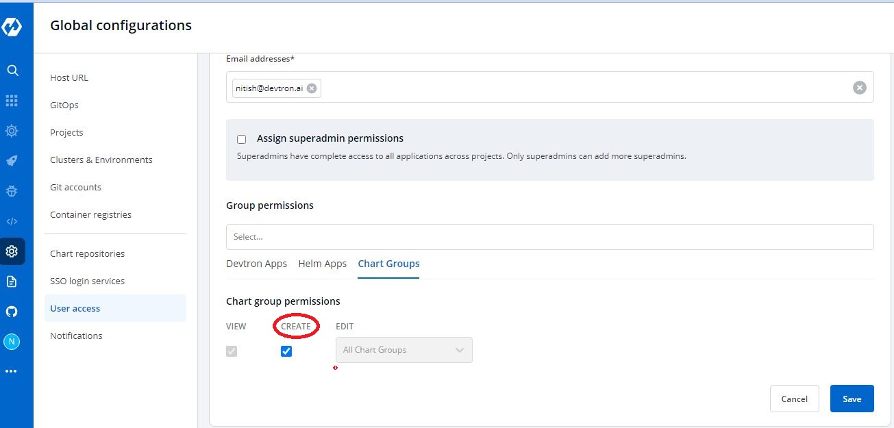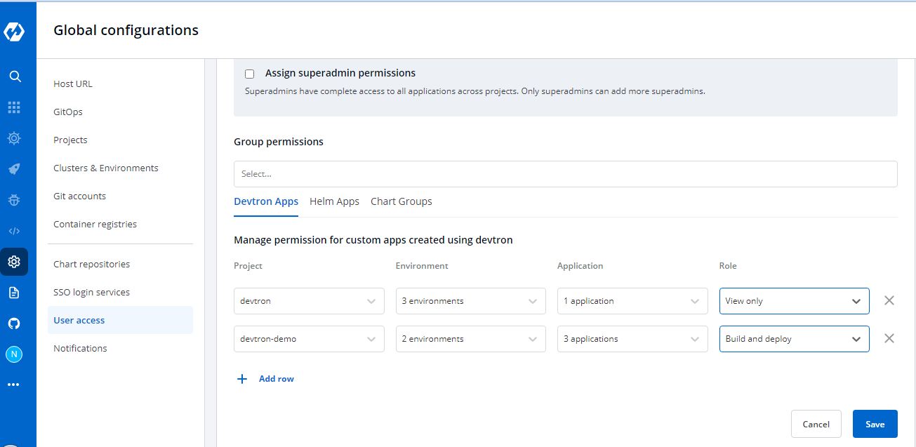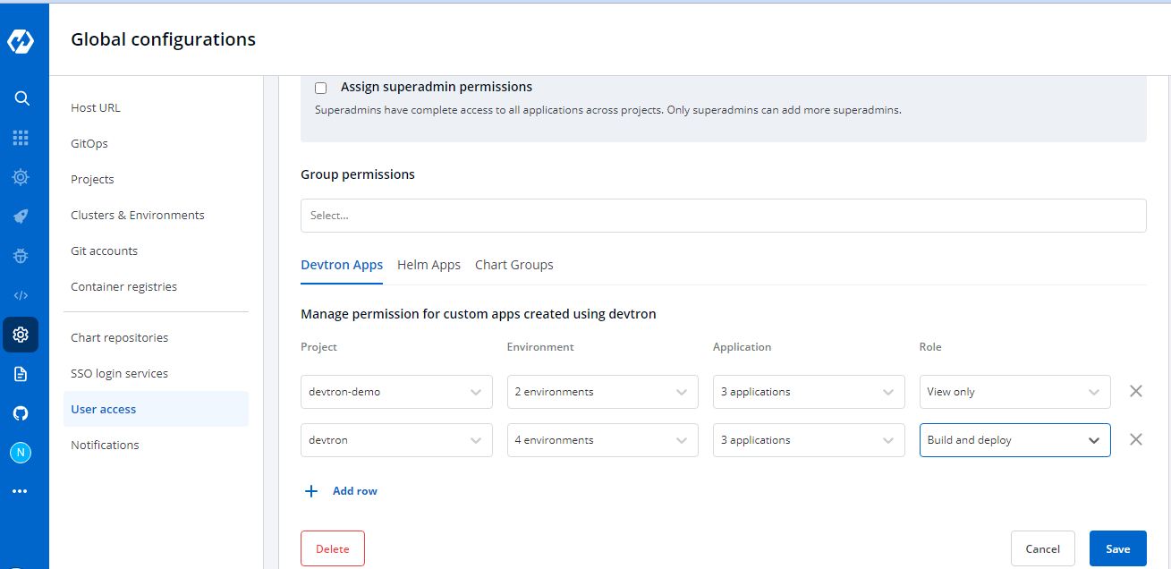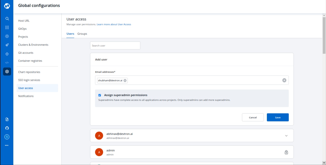 5. Super Admin: Users with super admin privileges have unrestricted access to all the Devtron resources. Super Admins can create, modify, delete and view any Devtron resource without any restriction; it's like Superman without the weakness of Kryptonite. Moreover, they can add and delete user access across any Devtron resource, add delete git repository credentials, container registry credentials, cluster, and environment.
