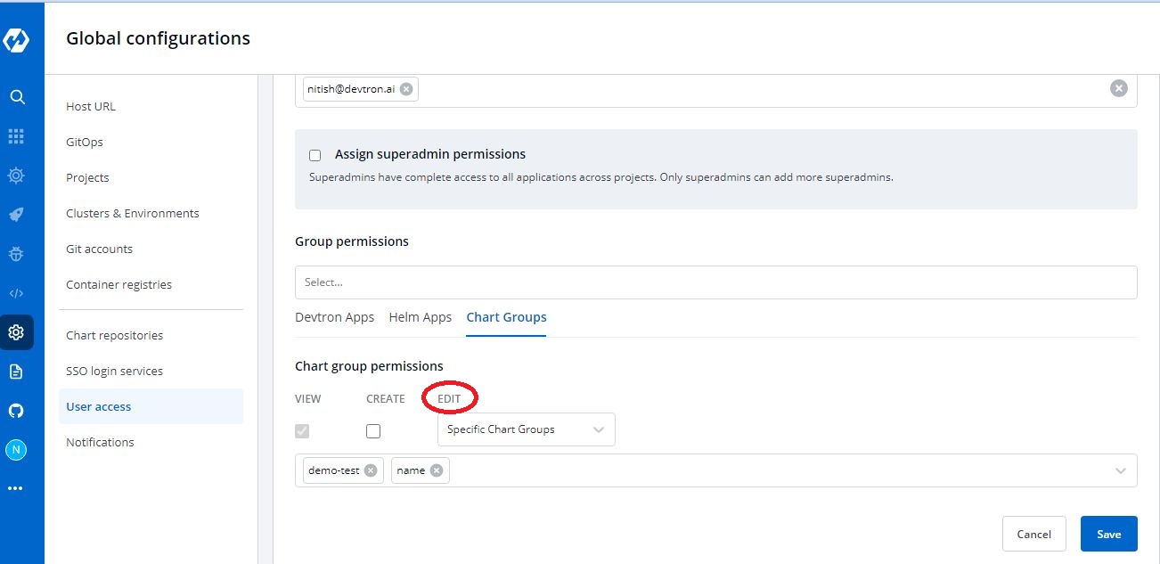 To permit a user to only edit the chart groups, check Specific chart group from Edit drop-down. In the following field, select the chart group for which you want to grant the user edit permission.