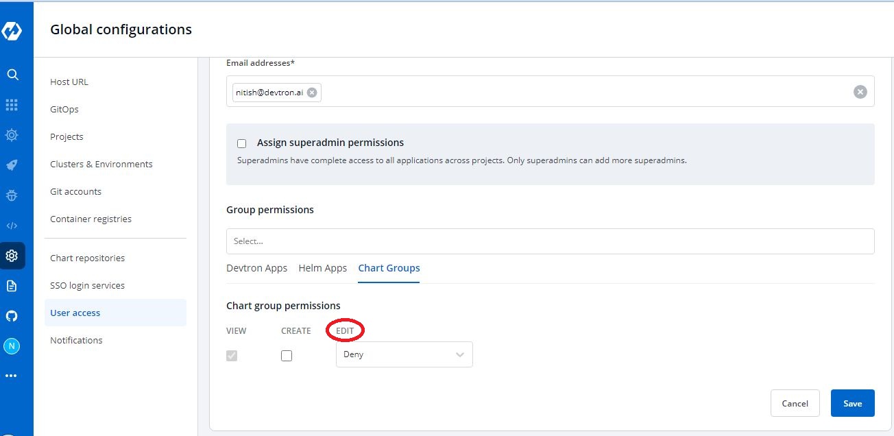 Select on Deny option from the drop-down, if you want to restrict the users to edit the chart groups.