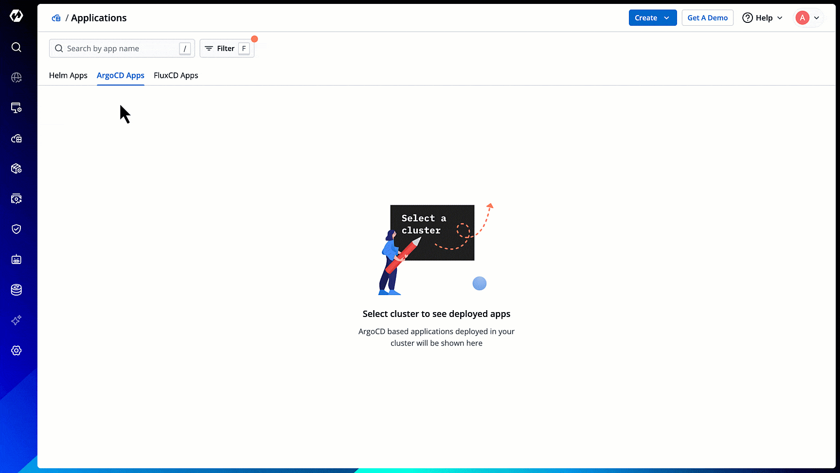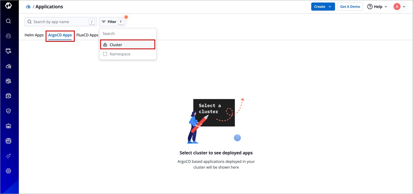 Select the cluster(s) from the dropdown to view the Argo CD apps available in the chosen cluster(s).