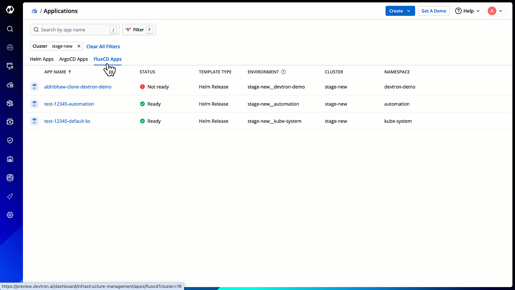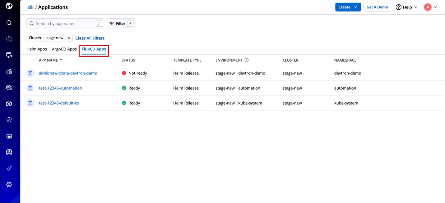 Flux CD doesn't have any official dashboard; however, Devtron supports the listing of your Flux CD apps in one dashboard. Here, the advantages are same as those of ArgoCD app listing.