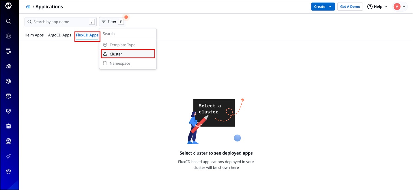 The cluster in which Flux CD apps exist should be added in Global Configurations → Clusters and Environments