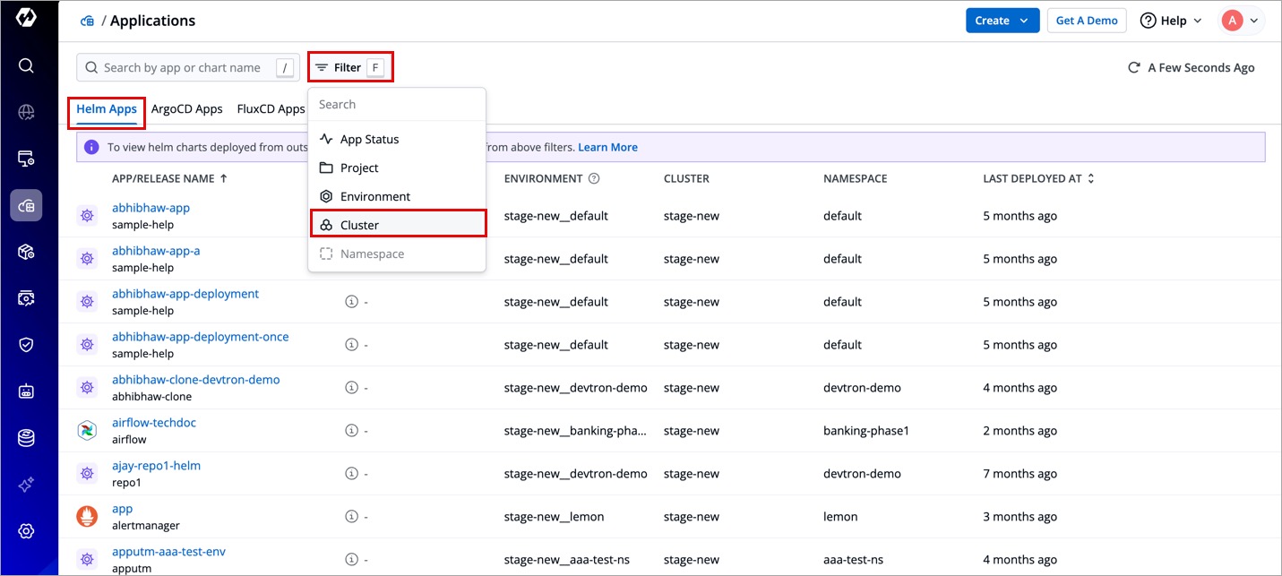 Use the Cluster selection dropdown to choose the external cluster(s). You will see your external Helm apps under the Helm Apps tab.