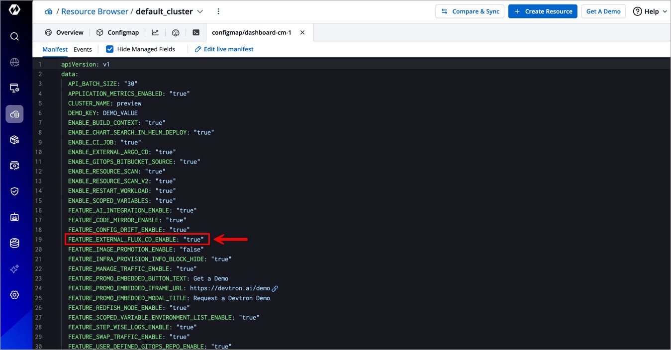 Using Devtron's Resource Browser, add the feature flag in the Dashboard ConfigMap as shown below.