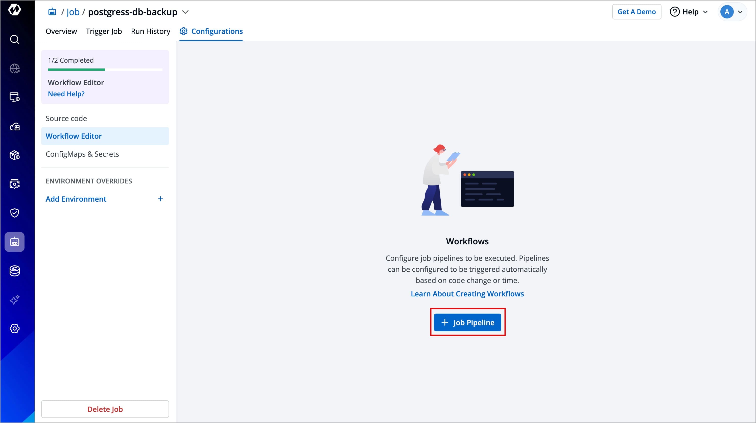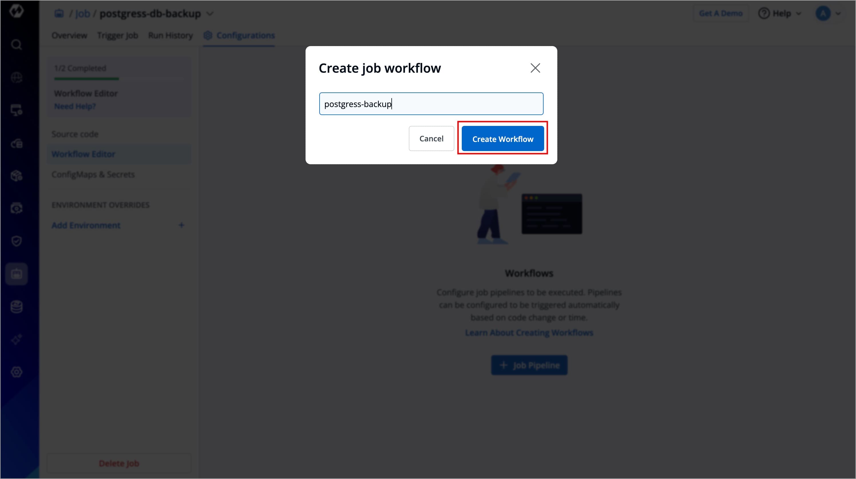 Click + Job Pipeline to create a new Job workflow. A pop-up Create job workflow will appear, asking you to enter a name for your Job workflow.