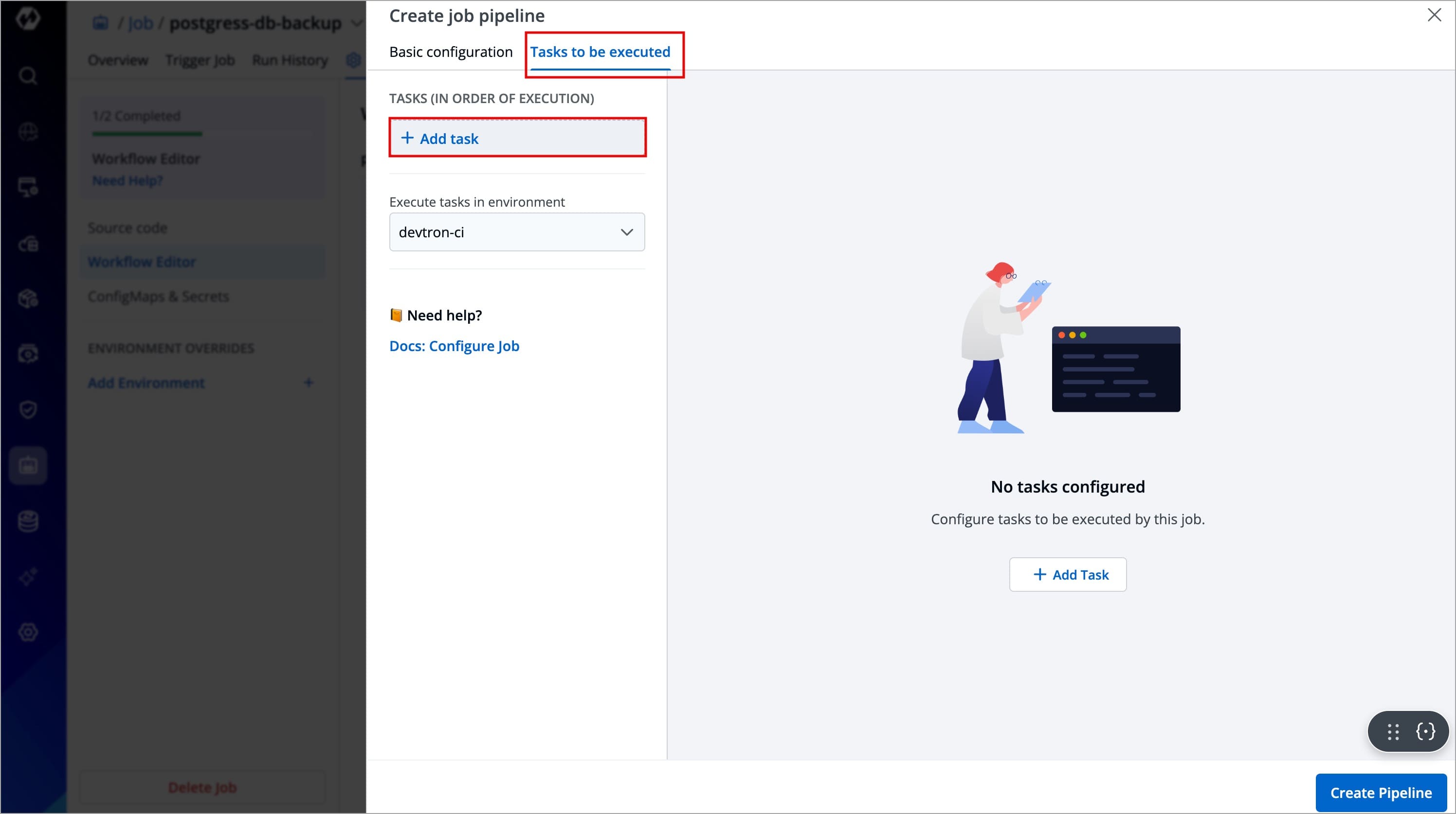 Navigate to Tasks to be executed in the Create job pipeline window.