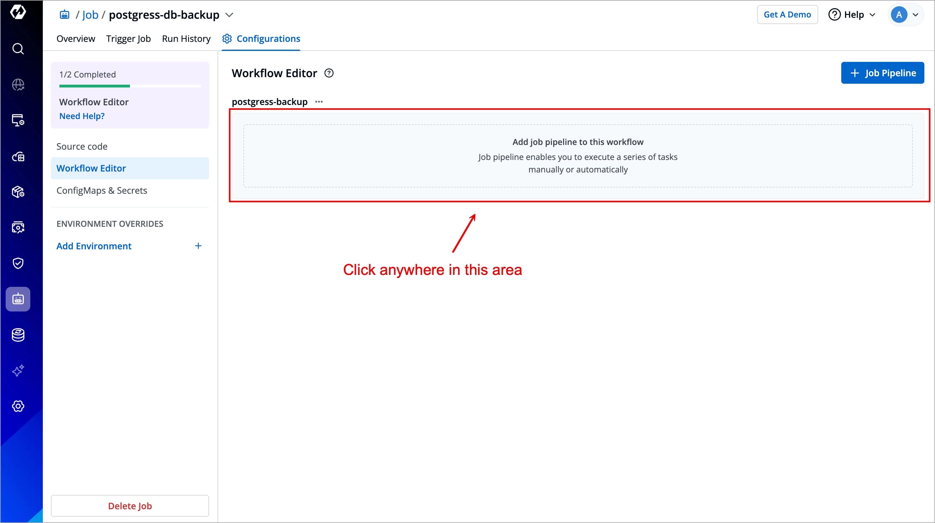 To add a job pipeline to your workflow, click anywhere in the Add job pipeline to this workflow area under the job workflow name. This opens the Create job pipeline Window in which you can create and configure your job.