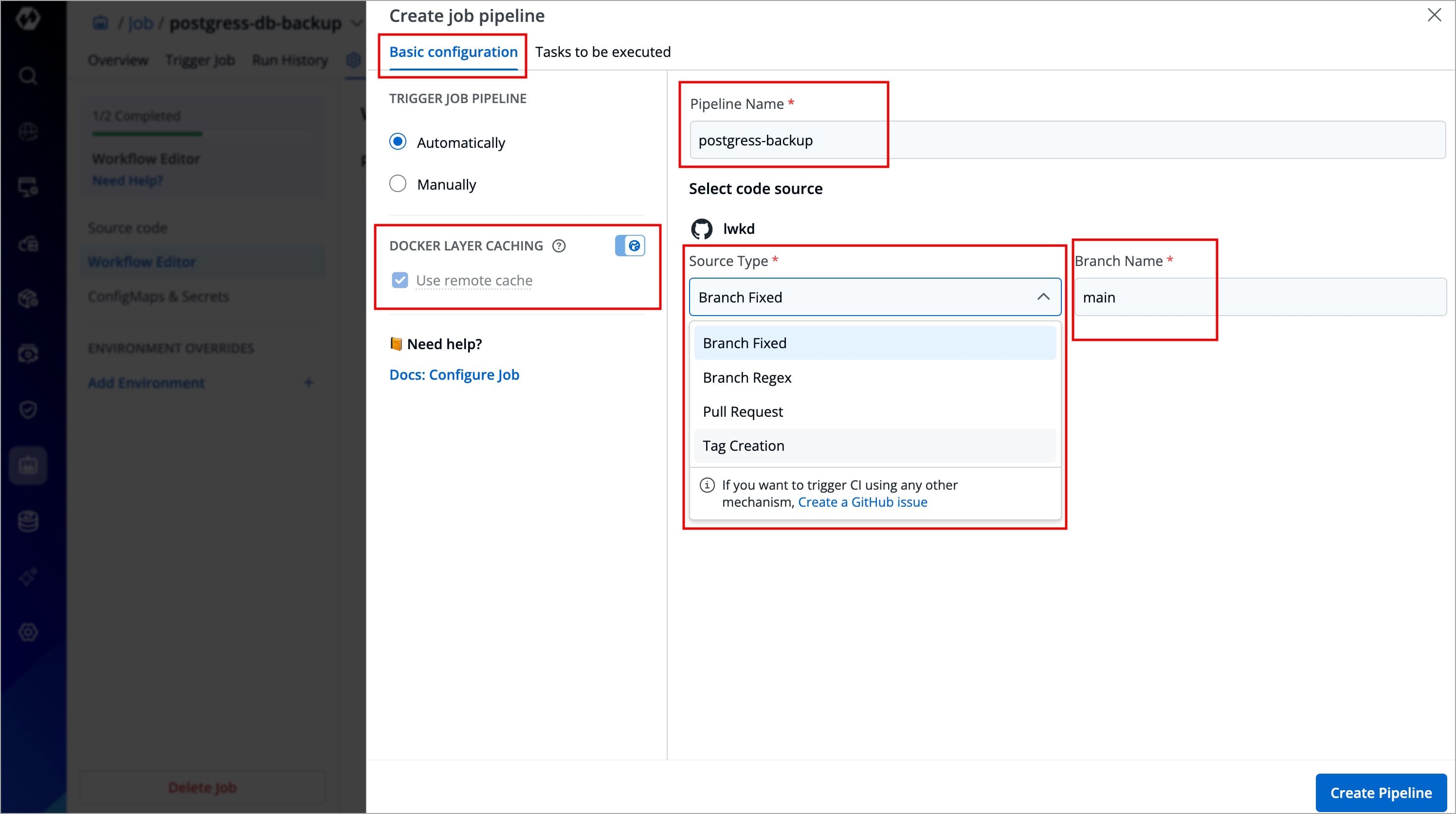 Source type | Source type to trigger the job pipeline. Available options: Branch Fixed, Branch Regex, Pull Request, Tag Creation |