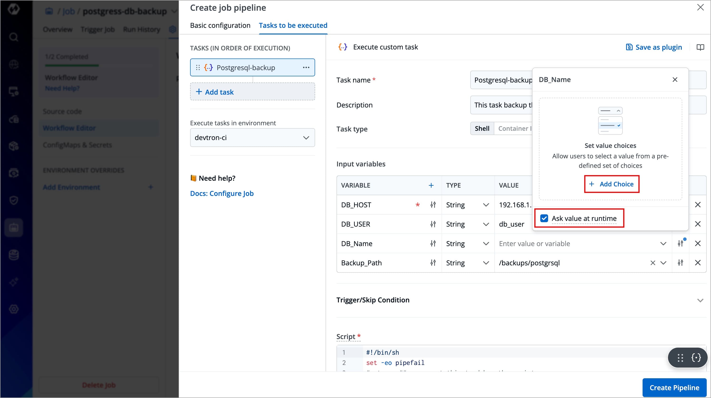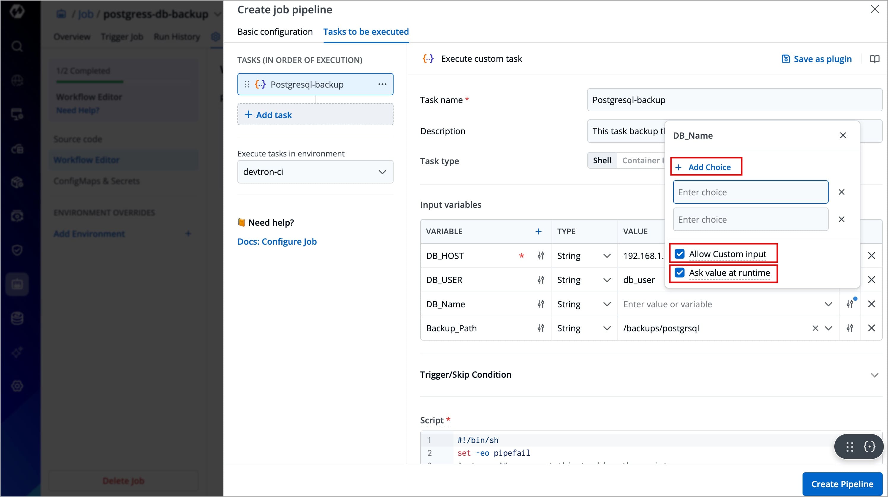 In Devtron, you can also define a task using a custom script to meet specific requirements. To create a task a task using a custom script, follow the steps below: