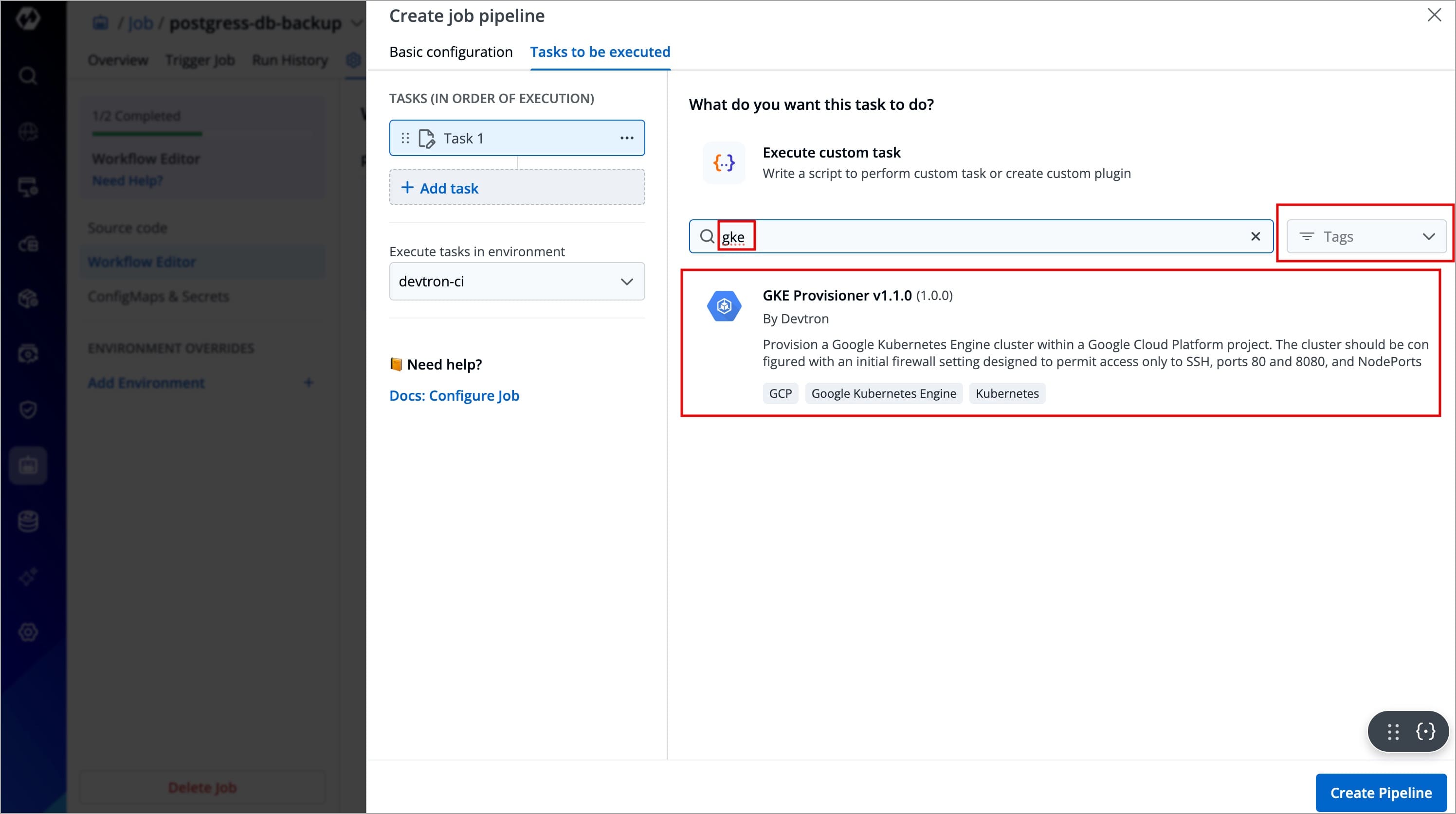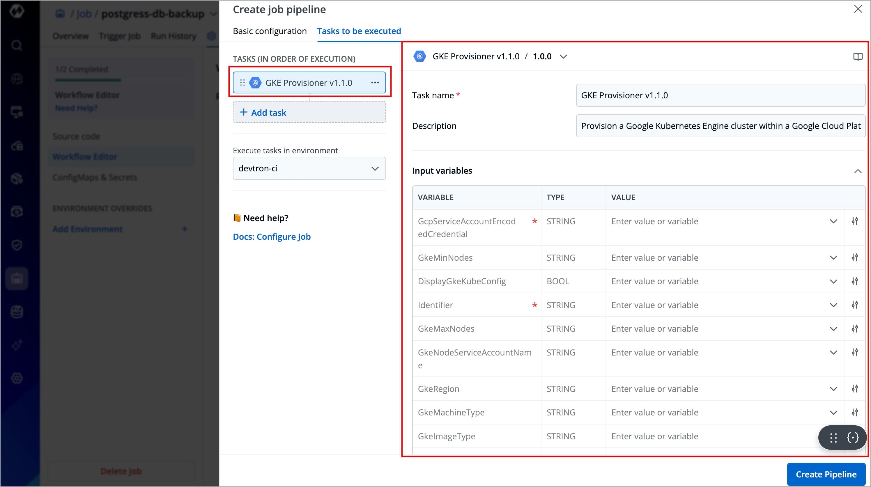 To create a task using the GKE Provisioner plugin, follow the steps below: