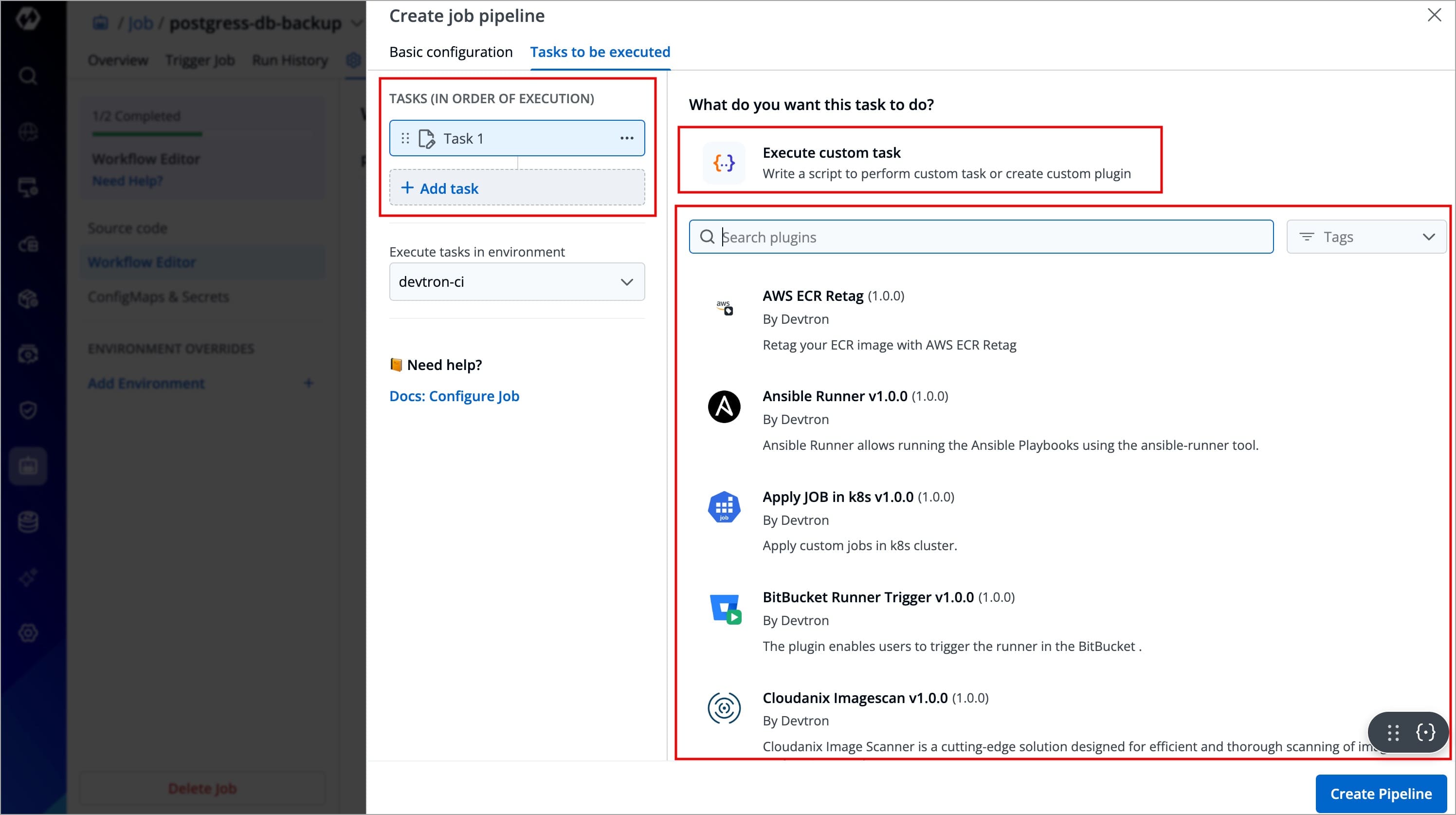 A new task will be added (on the left side of the 'Create job pipeline' window). You can configure the task either by selecting one of the available preset plugins or by Executing a custom script