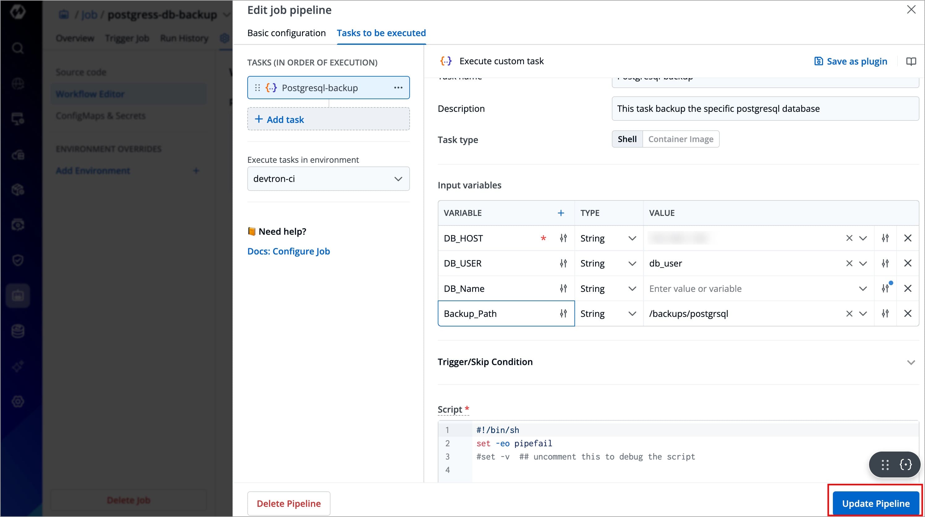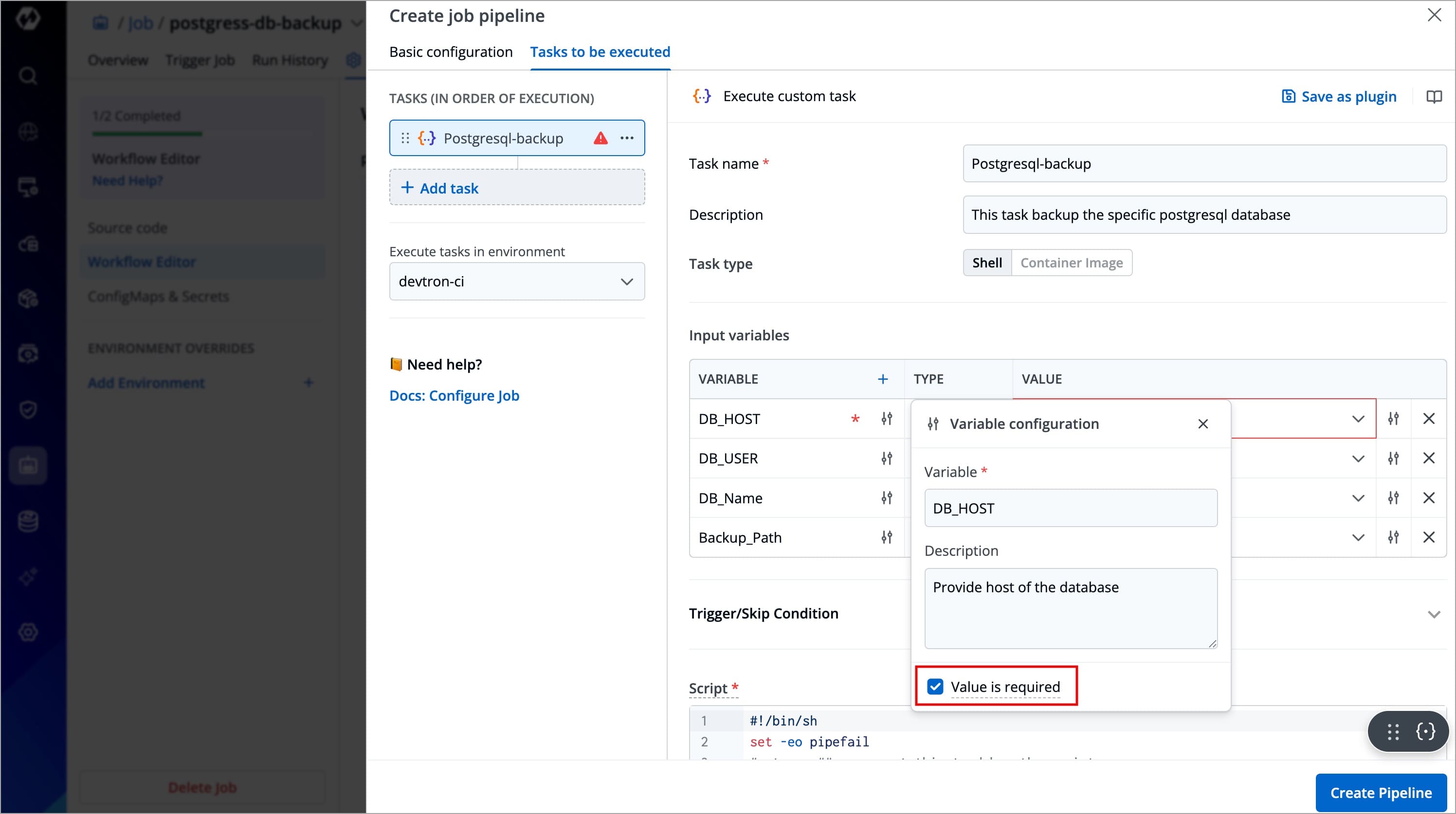 Let's take an example of a Shell task for a job that allows you to back up a specific PostgreSQL database and store it as a file.
