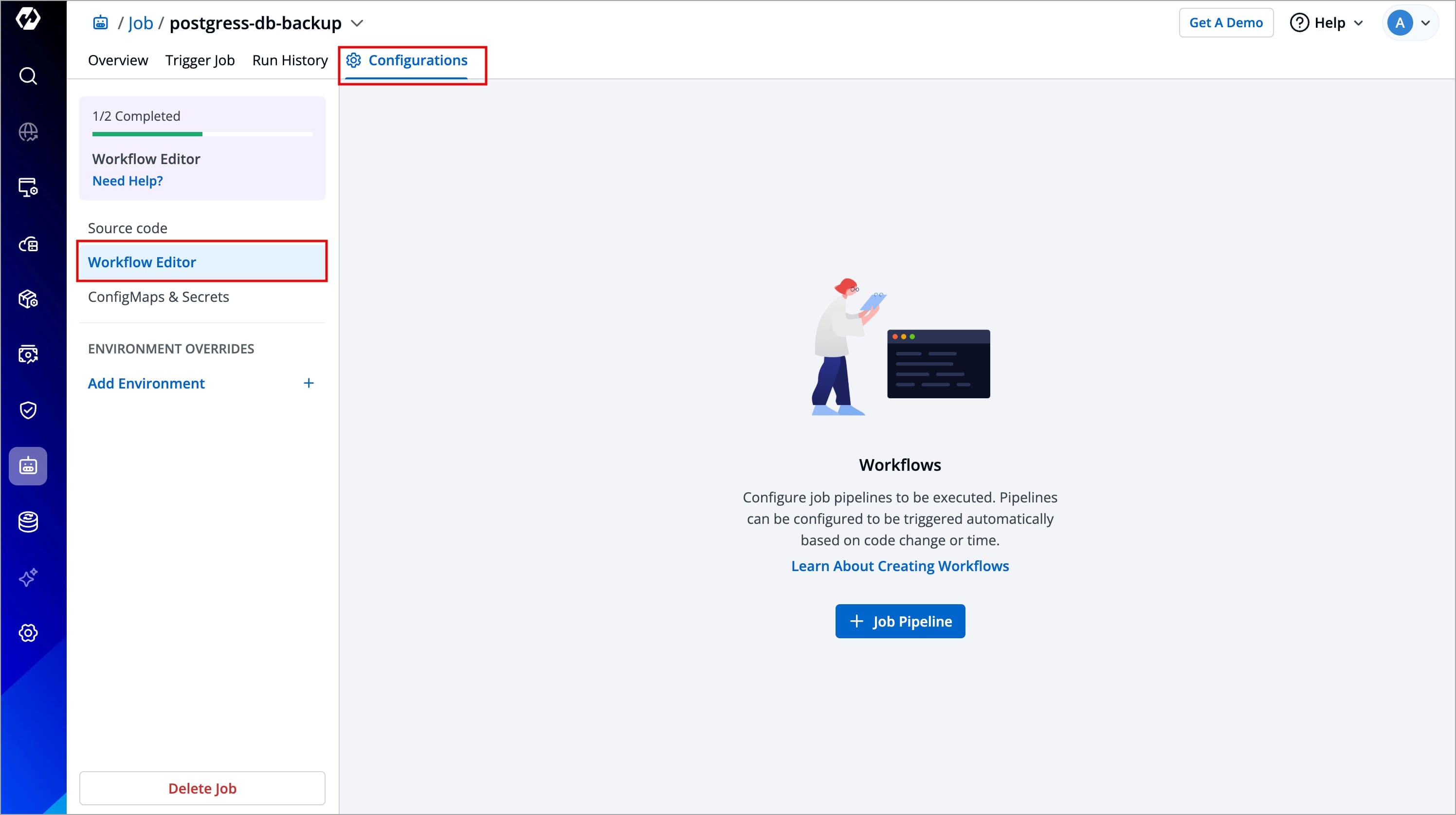 Navigate to Configurations (tab) → Workflow Editor for the job you want to delete.