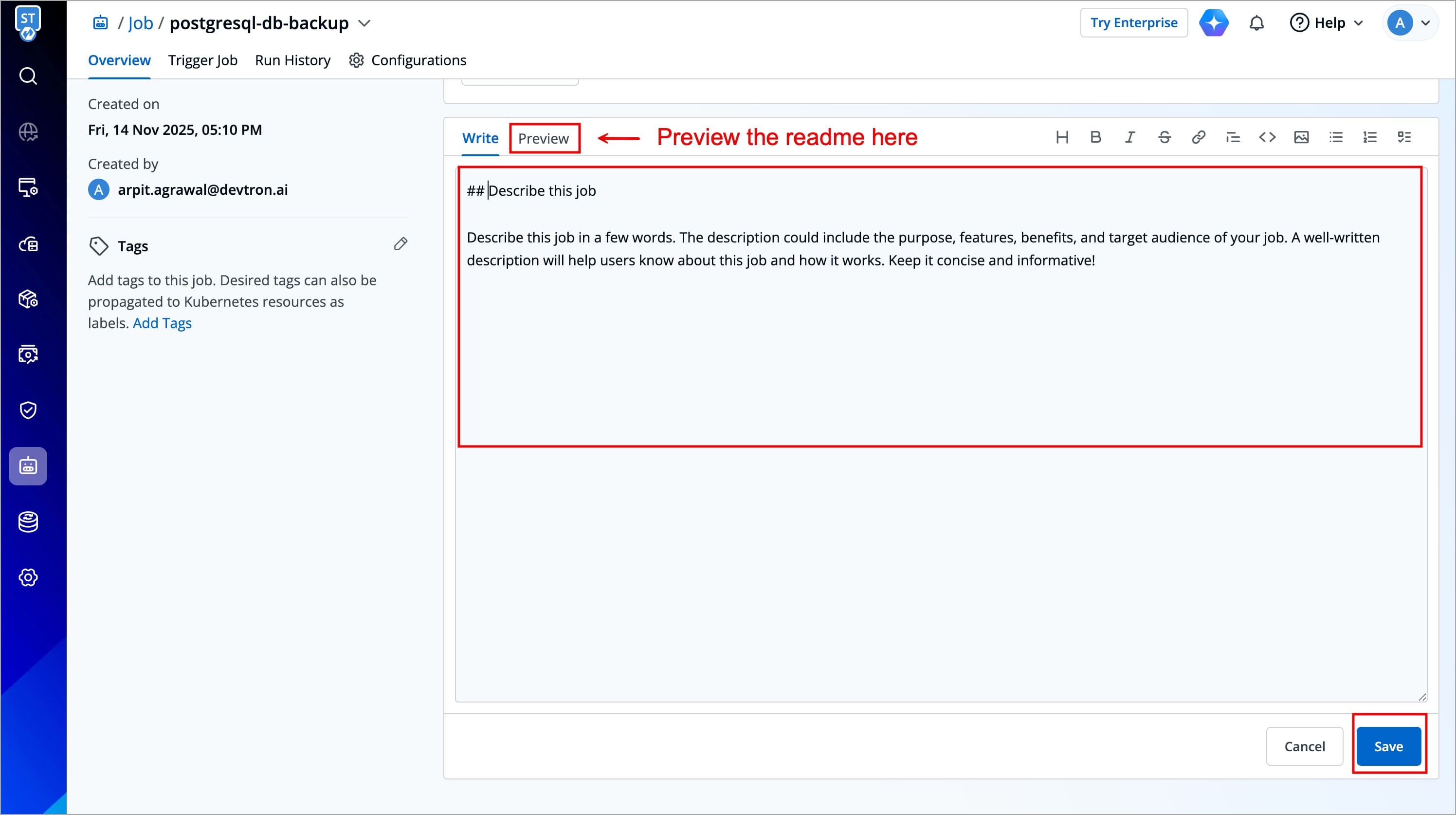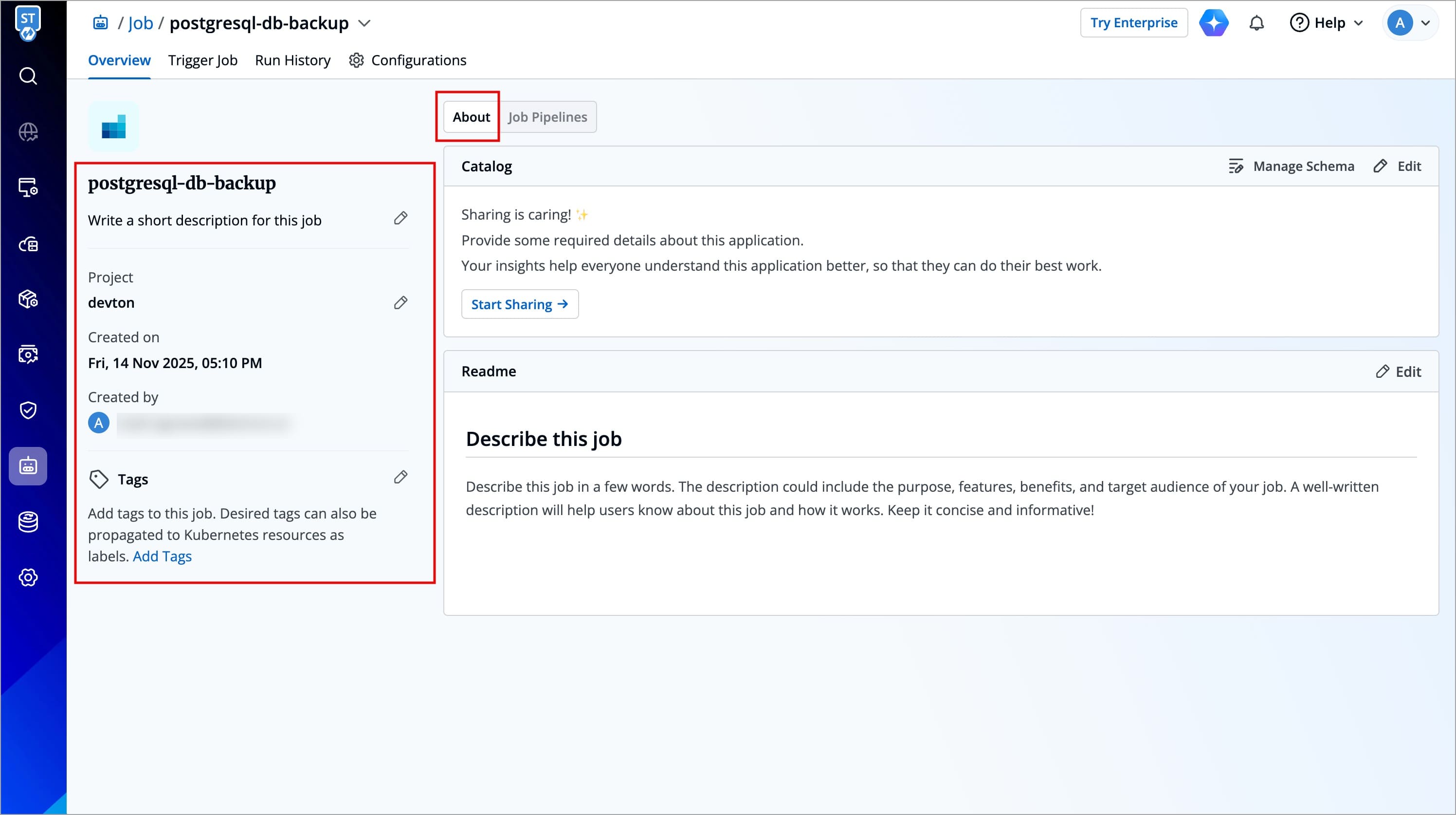 About: Contains job's metadata such as name, description, project, project, creator, and it also includes options to manage tags.