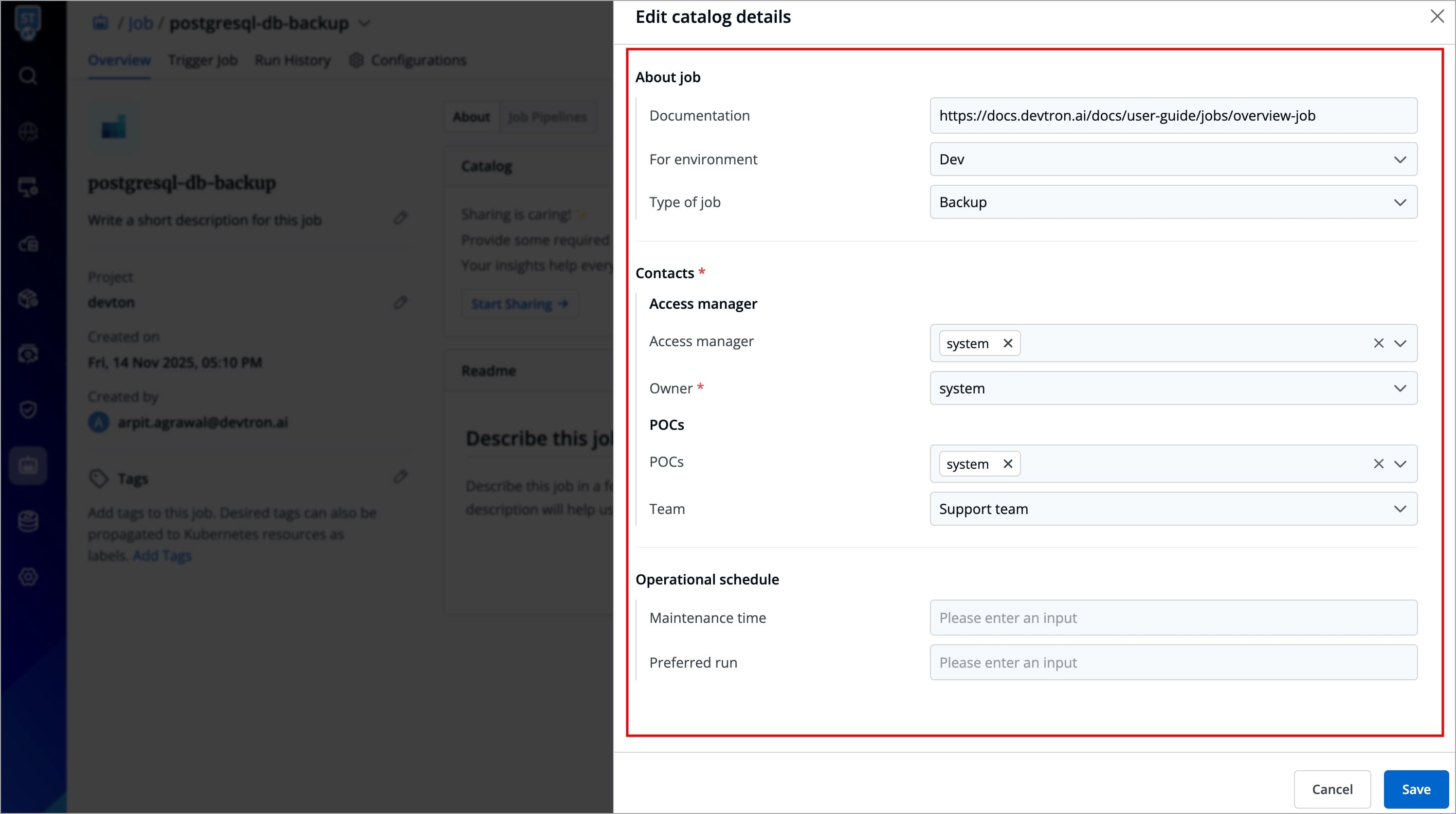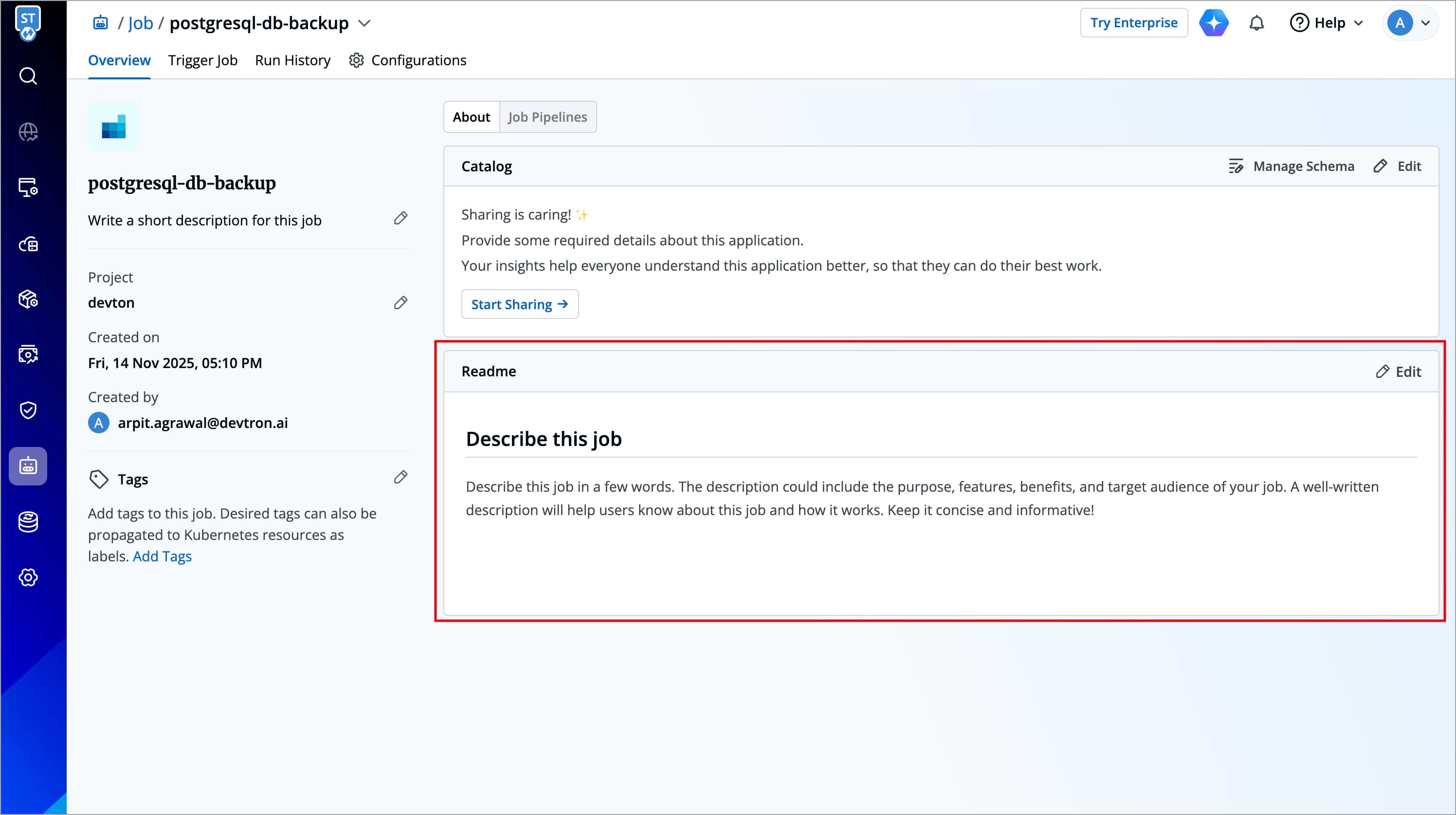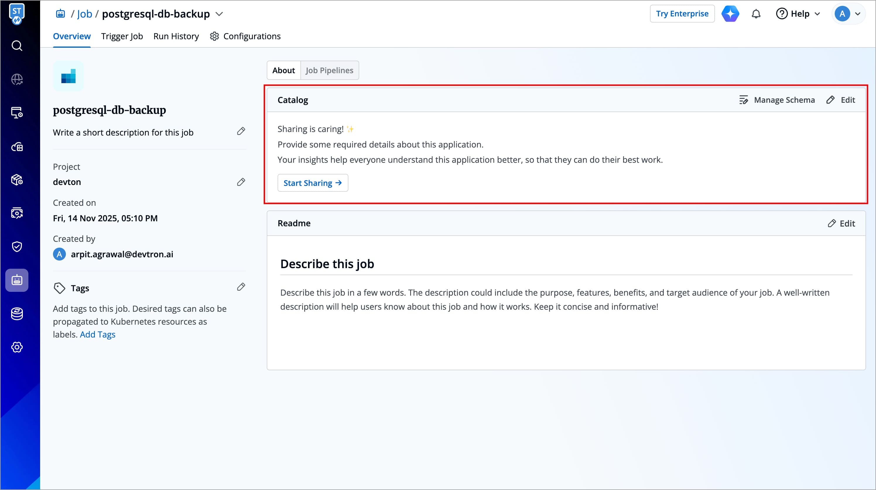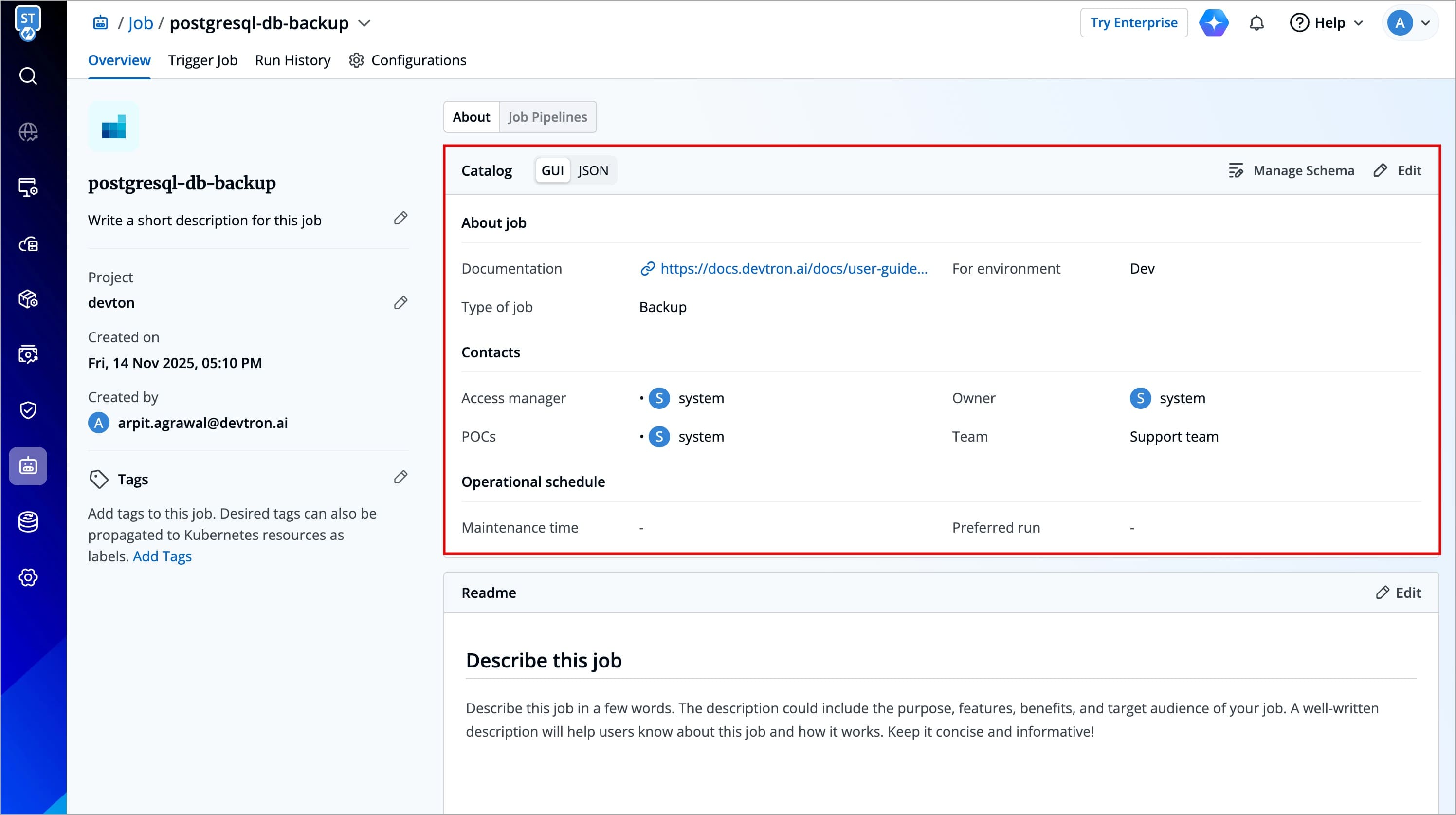 You can use the Catalog to maintain information about your job, such as Environment Variables, Resources(CPU and RAM), service documentation, etc. This makes it easier for others to understand, manage, and use your job.