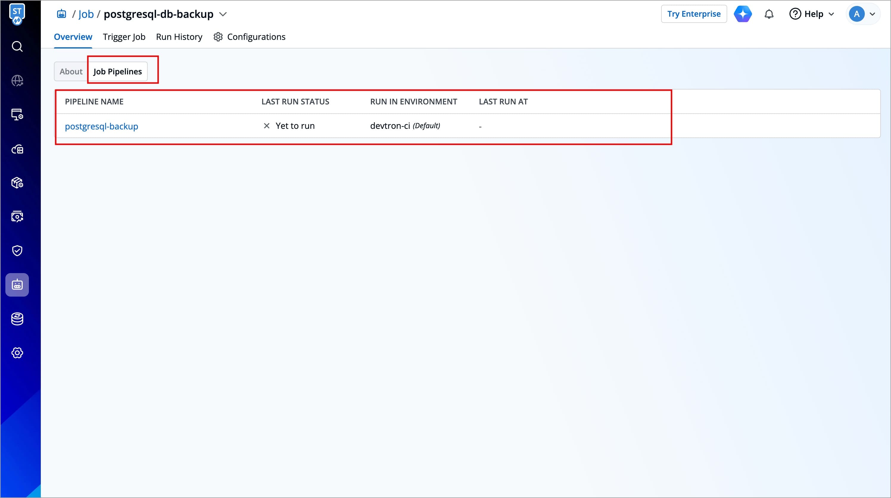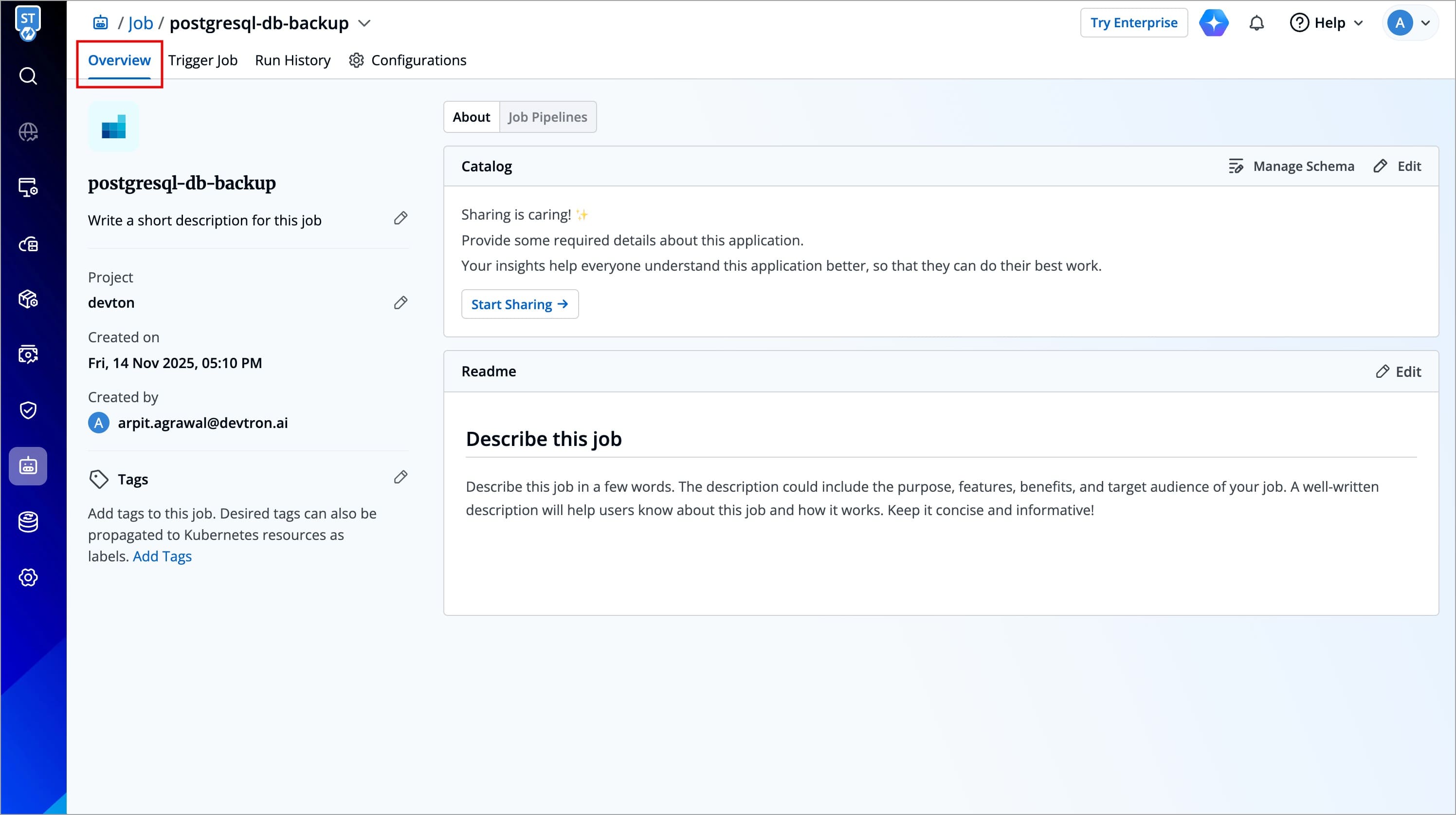 The Overview page provides a centralized view of a job’s details within Devtron. It allows users to quickly access information about the job, manage tags, and view job pipelines all in a single, organized interface.