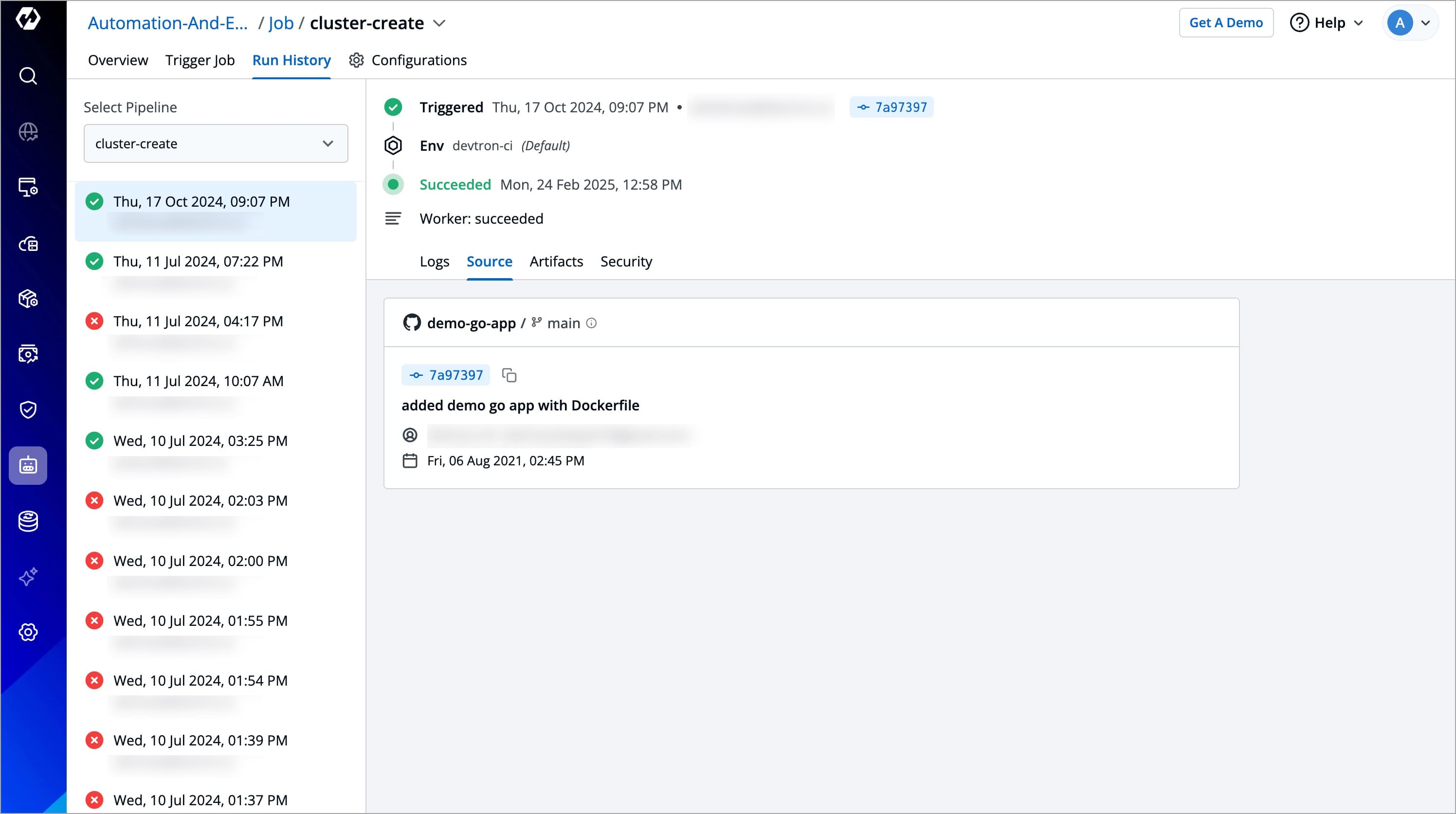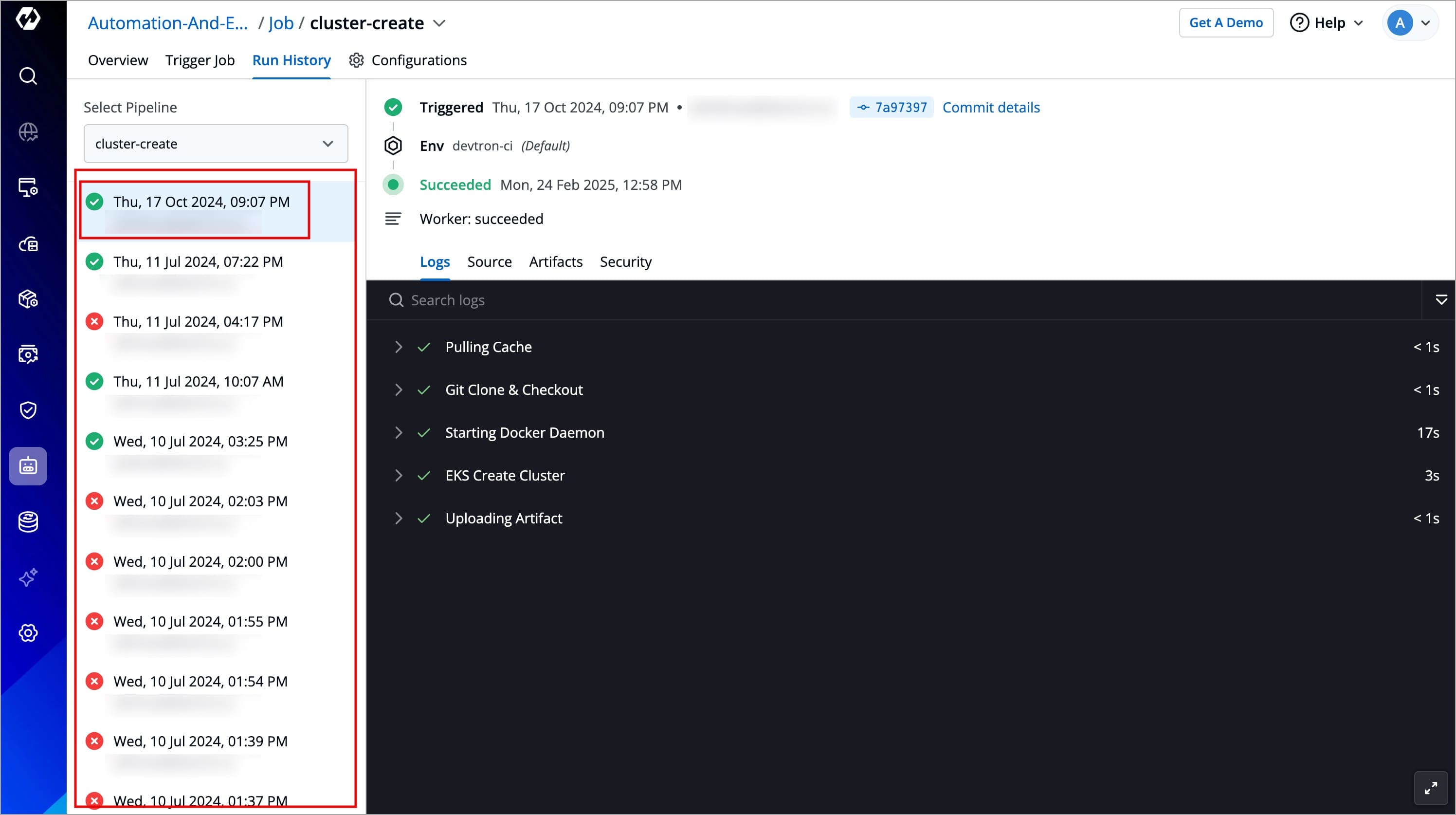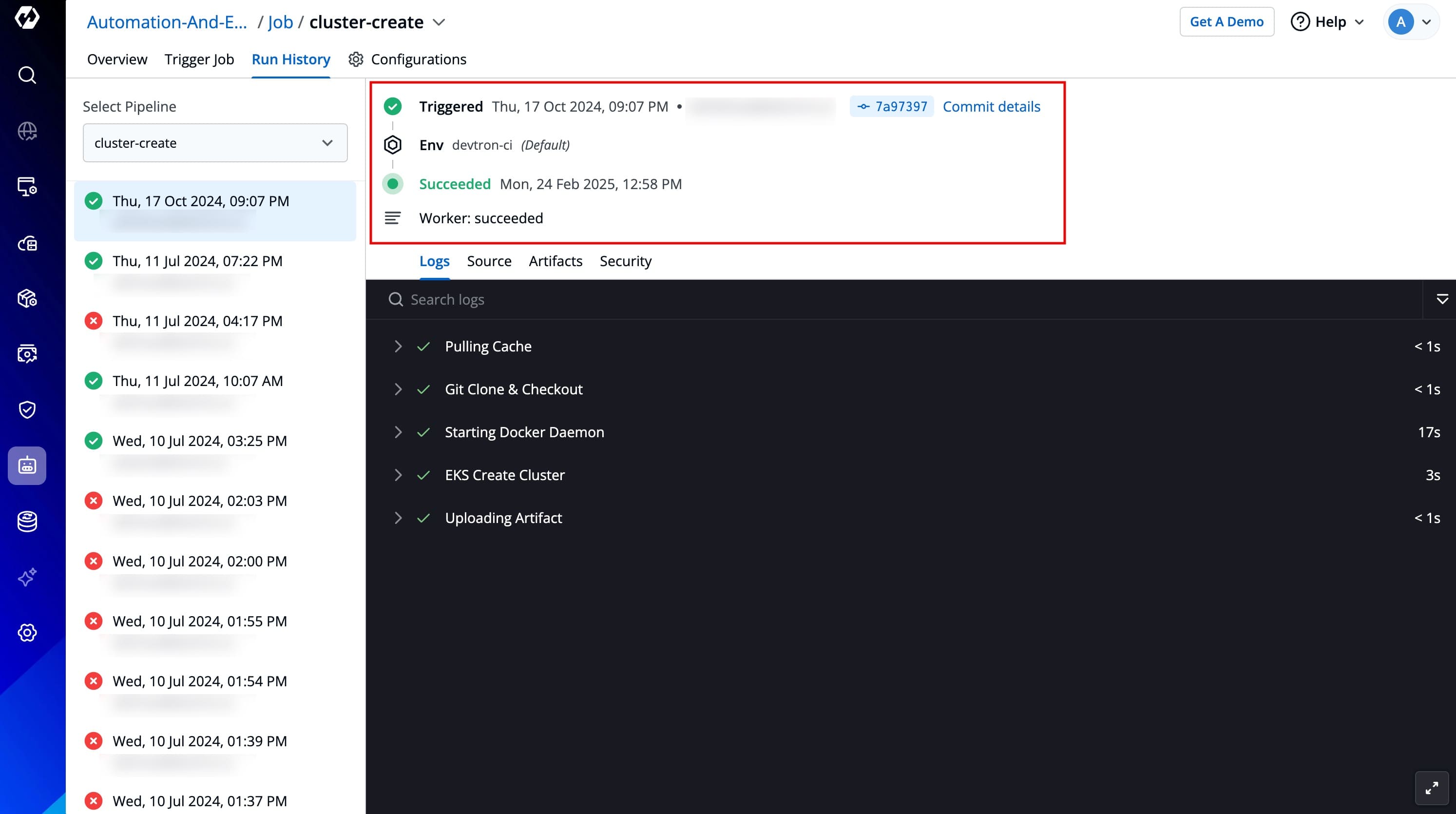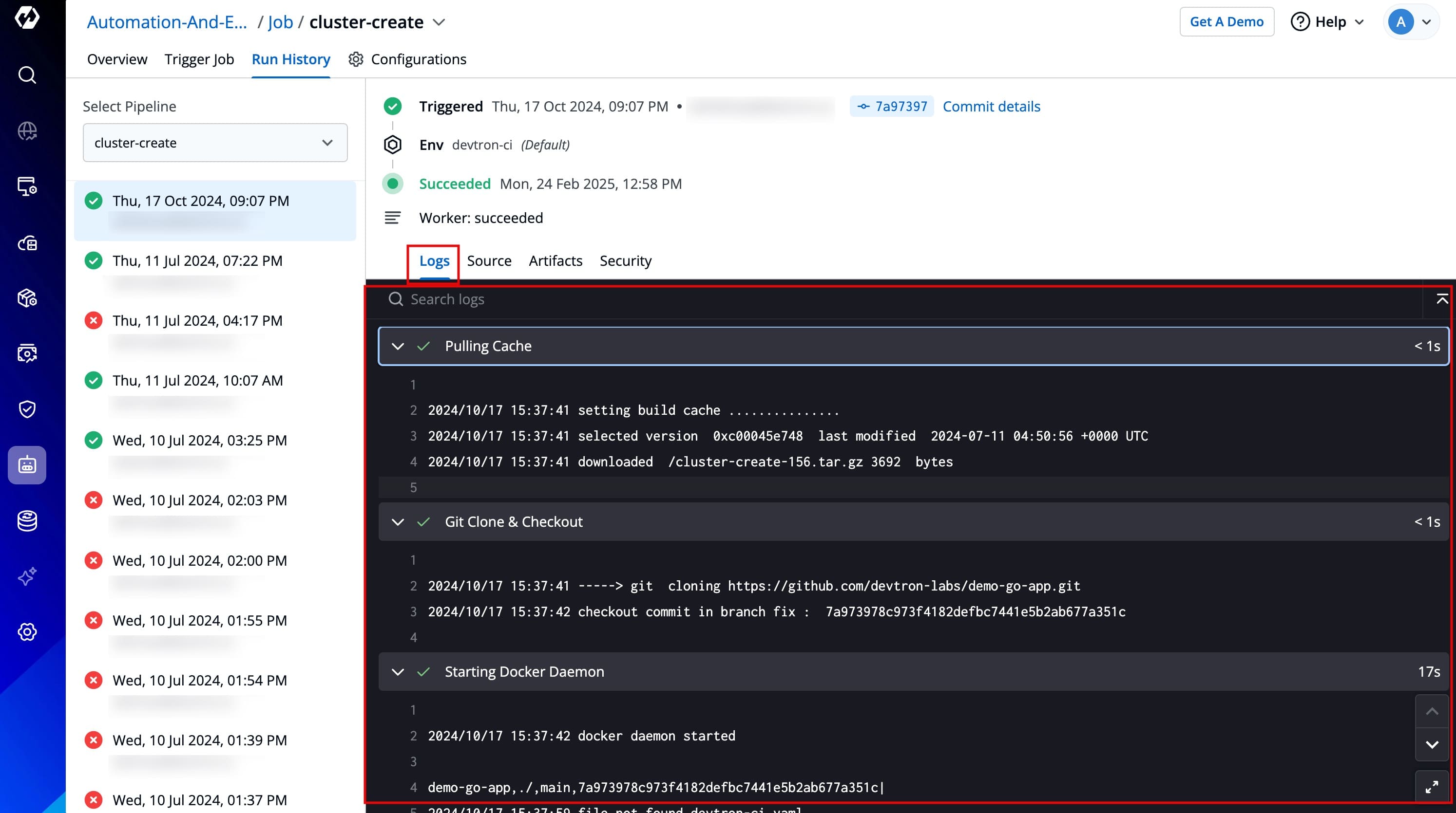 Field Description TriggeredShows the date, time, user, and commit ID that initiated this run. EnvironmentIndicates which execution environment (e.g., devtron-ci) was used for this job. Execution startedTimestamp marking when the job actually began running. Execution succeededTimestamp marking when the job finished successfully. Worker statusFinal outcome of the worker performing the job (e.g., Succeeded or Failed). On failure, the error message is also shown