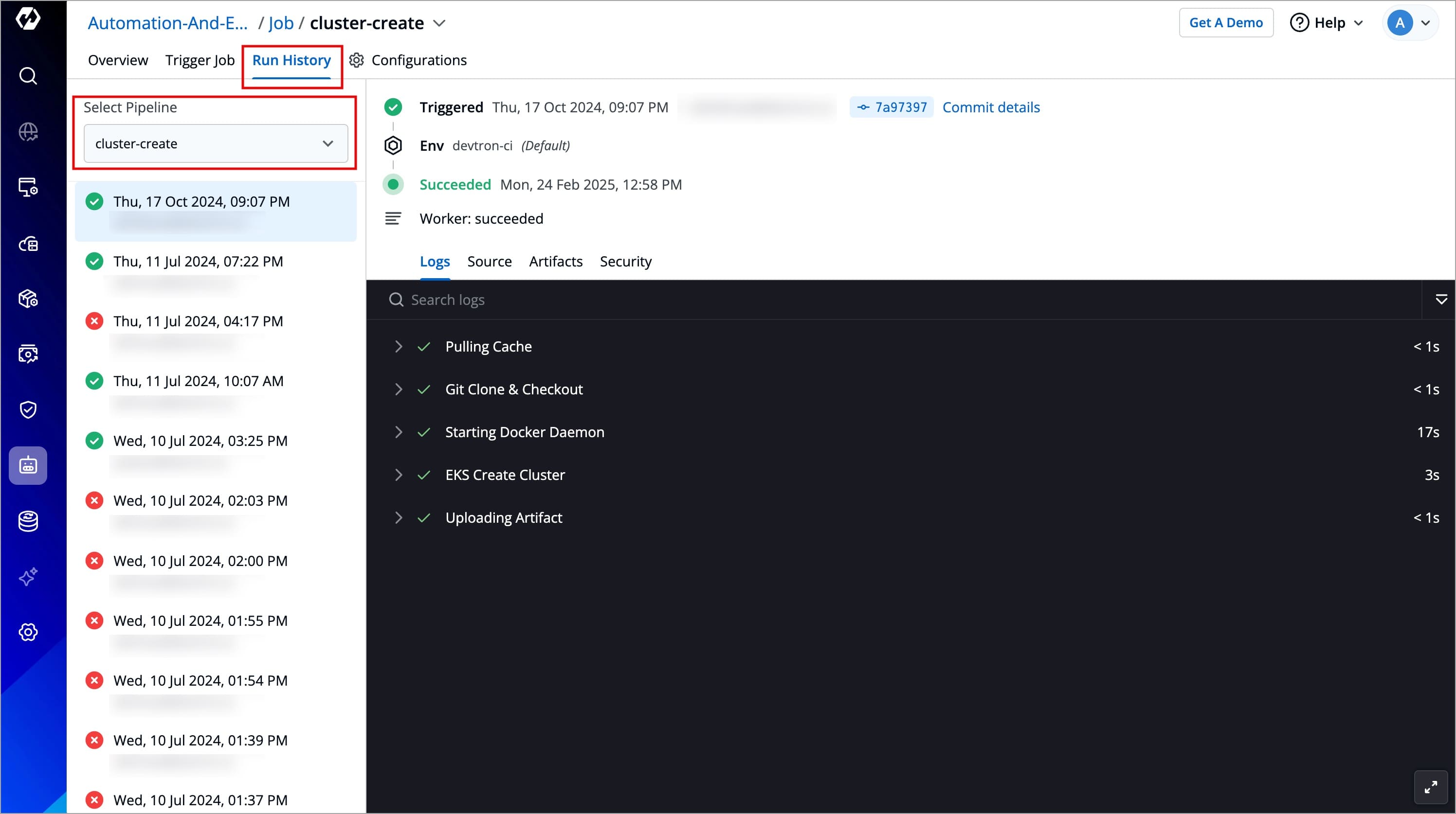 Navigate to the Run History tab of your job, and all the executions will appear in a reverse chronological order under the pipeline name. In case you have configured multiple job pipelines within a job, you need to select the pipeline from the Select Pipeline dropdown in the top-left corner.