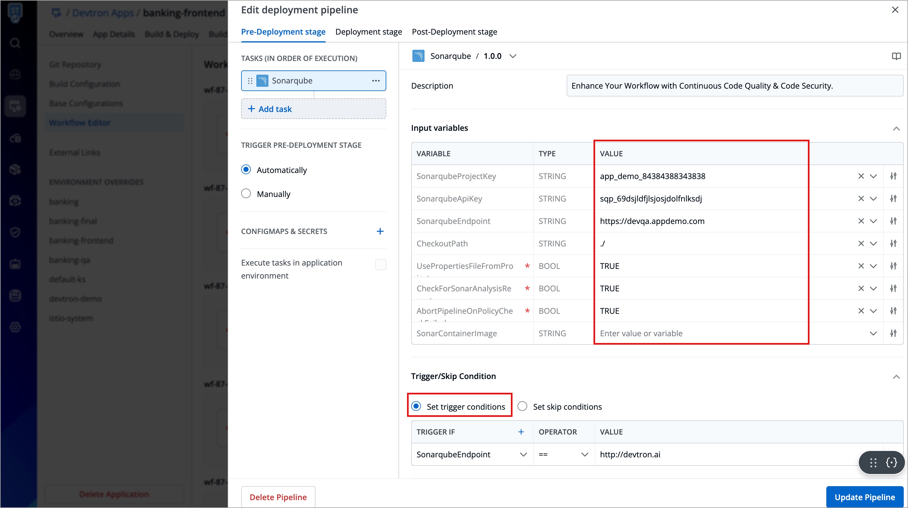 | AbortPipelineOnPolicyCheckFailed | Boolean | Enter either true or false accordingly whether you want to check if the policy fails or not |