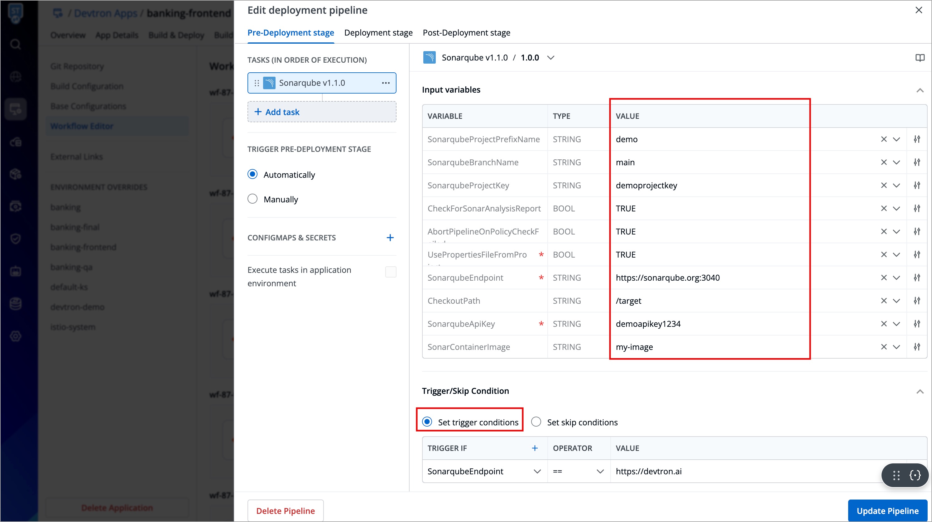 Pass/Fail Conditionrefers to a conditional statement to pass or fail the Pre-Build Stage (or Post-Build Stage). You can select either:Set pass conditionsorSet failure conditions