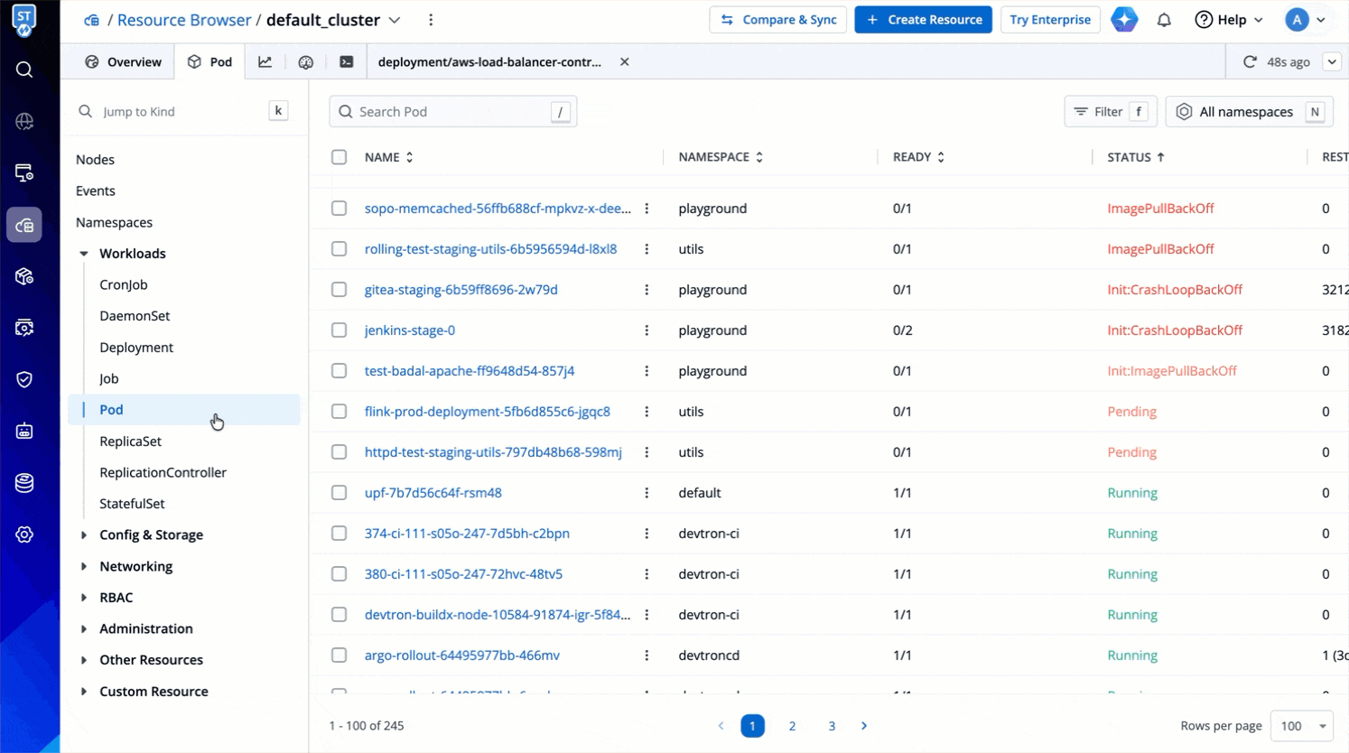 You can use the checkbox to select the resources/workloads you wish to delete or restart.