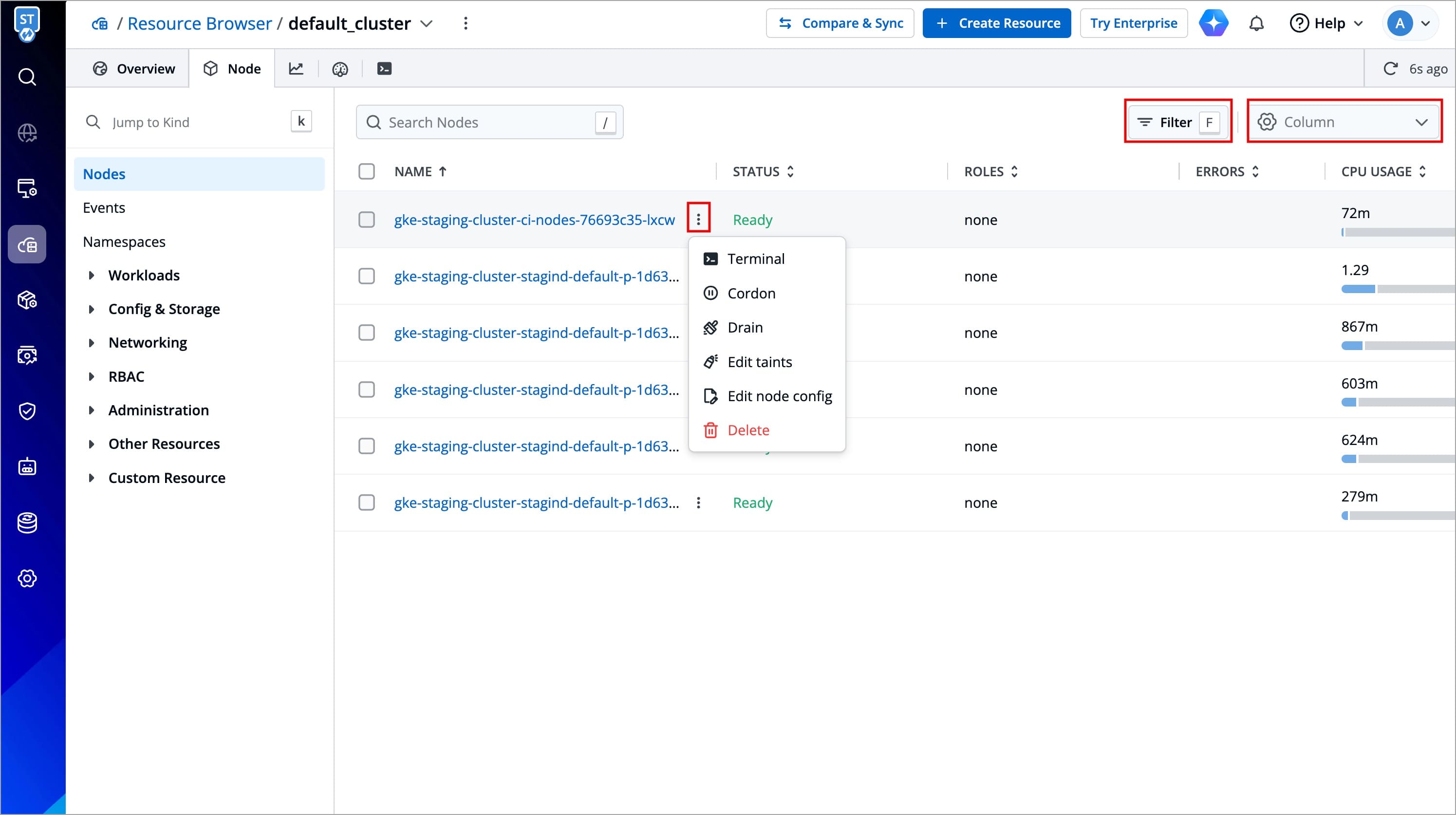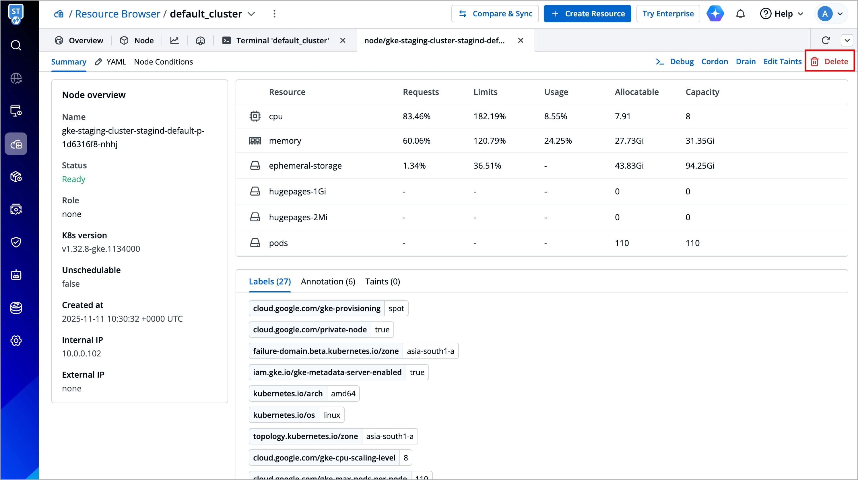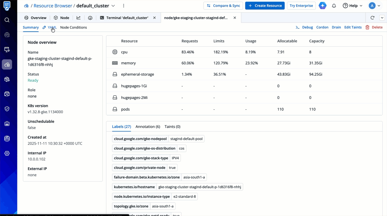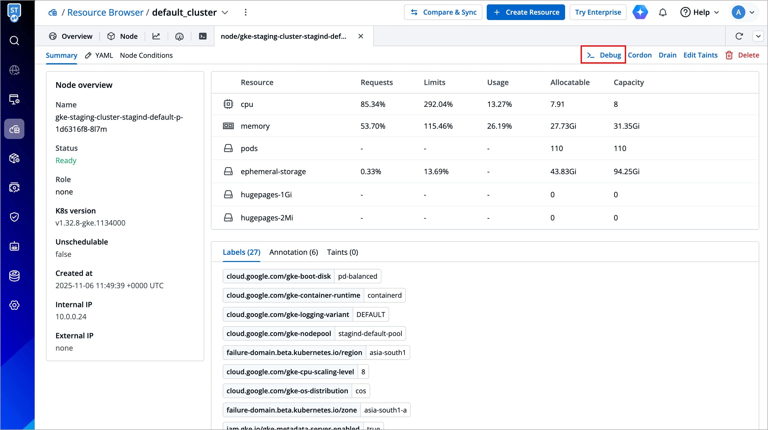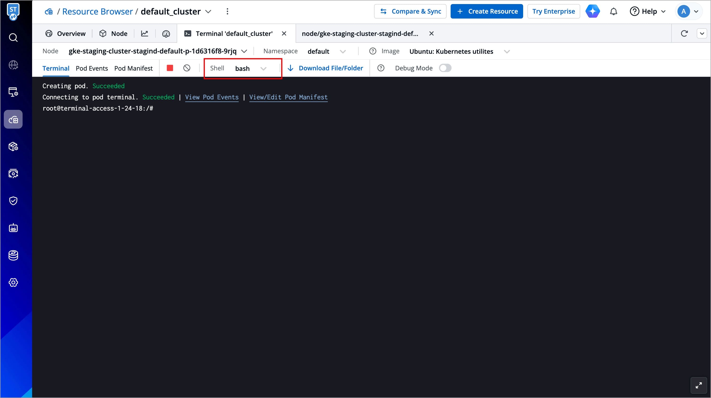 You can debug a node via Cluster Terminal by selecting your namespace and image from the list that has all CLI utilities like kubectl, helm, netshoot etc. or can use a custom image, which is publicly available.