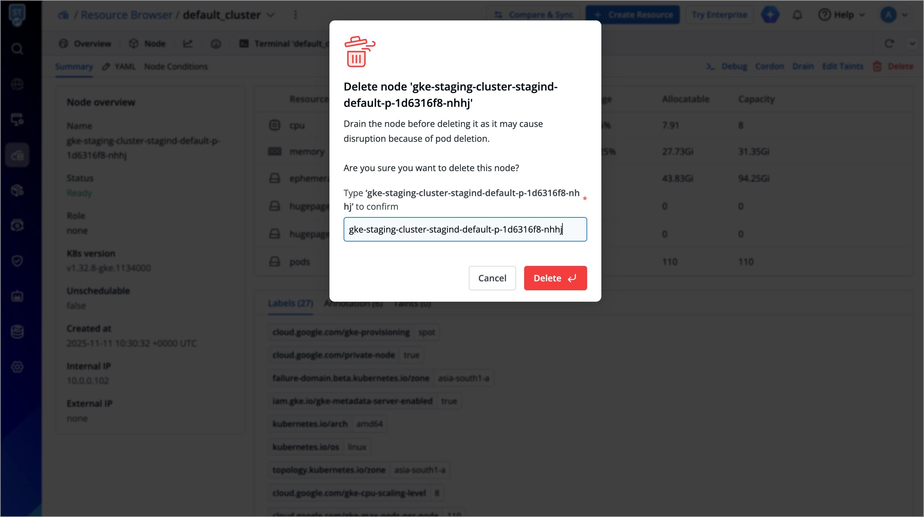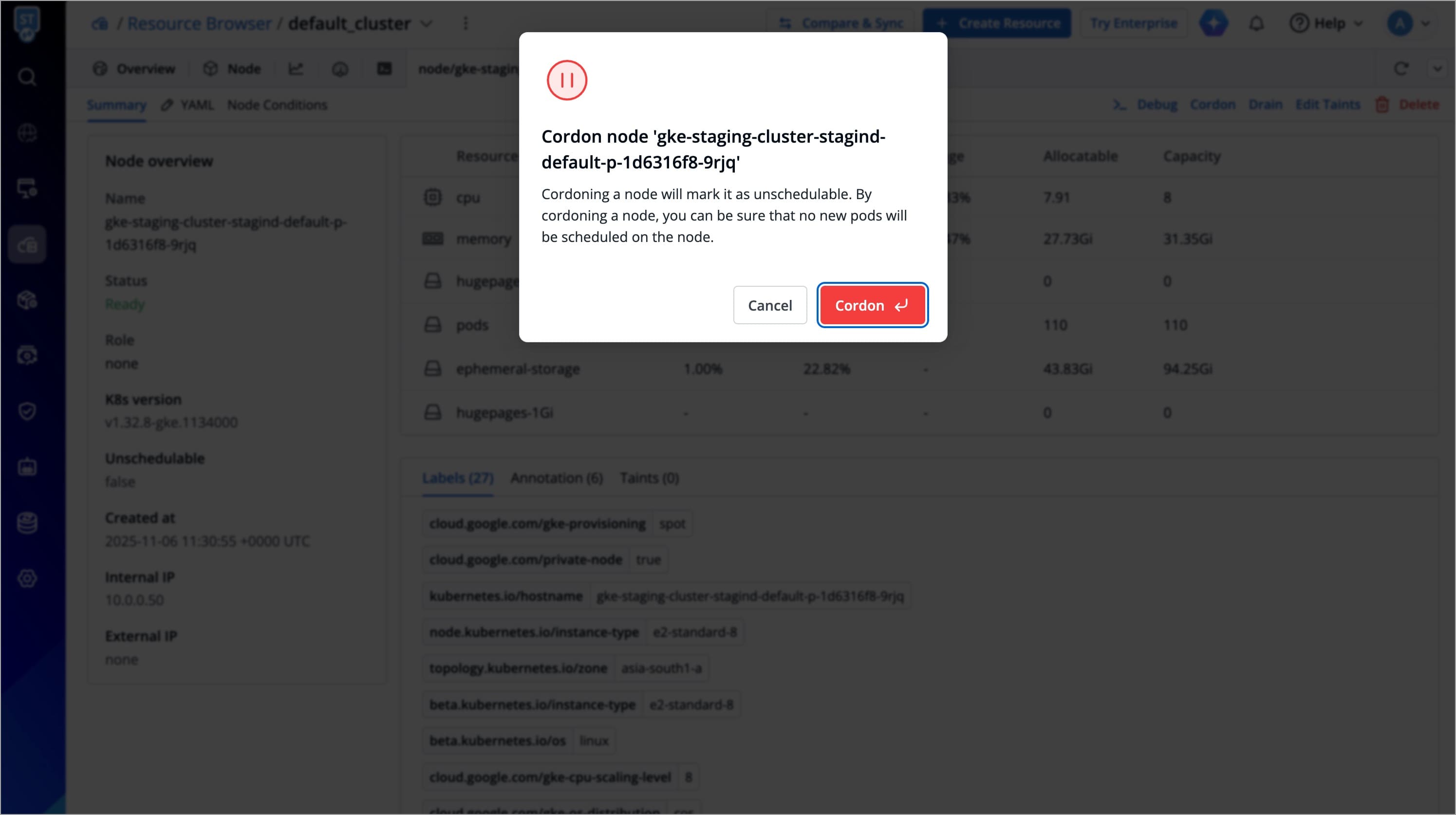 A confirmation dialog box will appear, click Cordon Node to proceed.