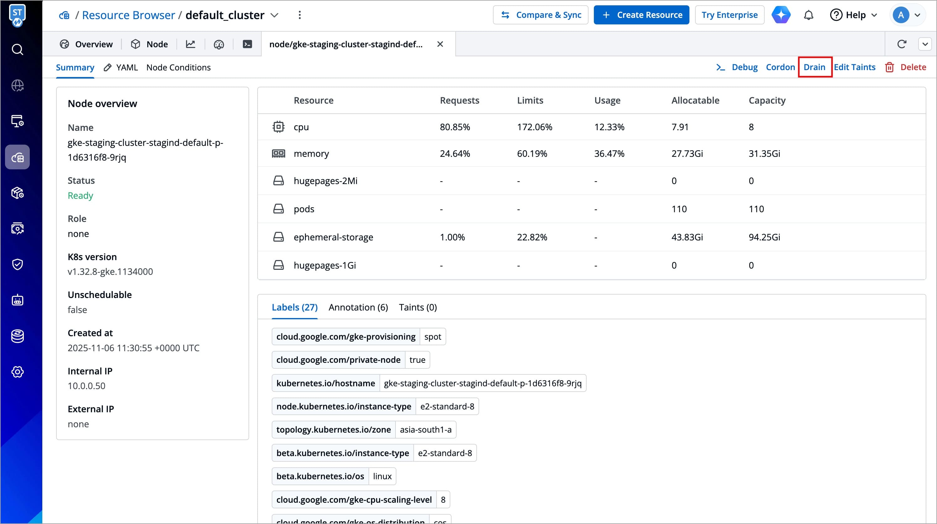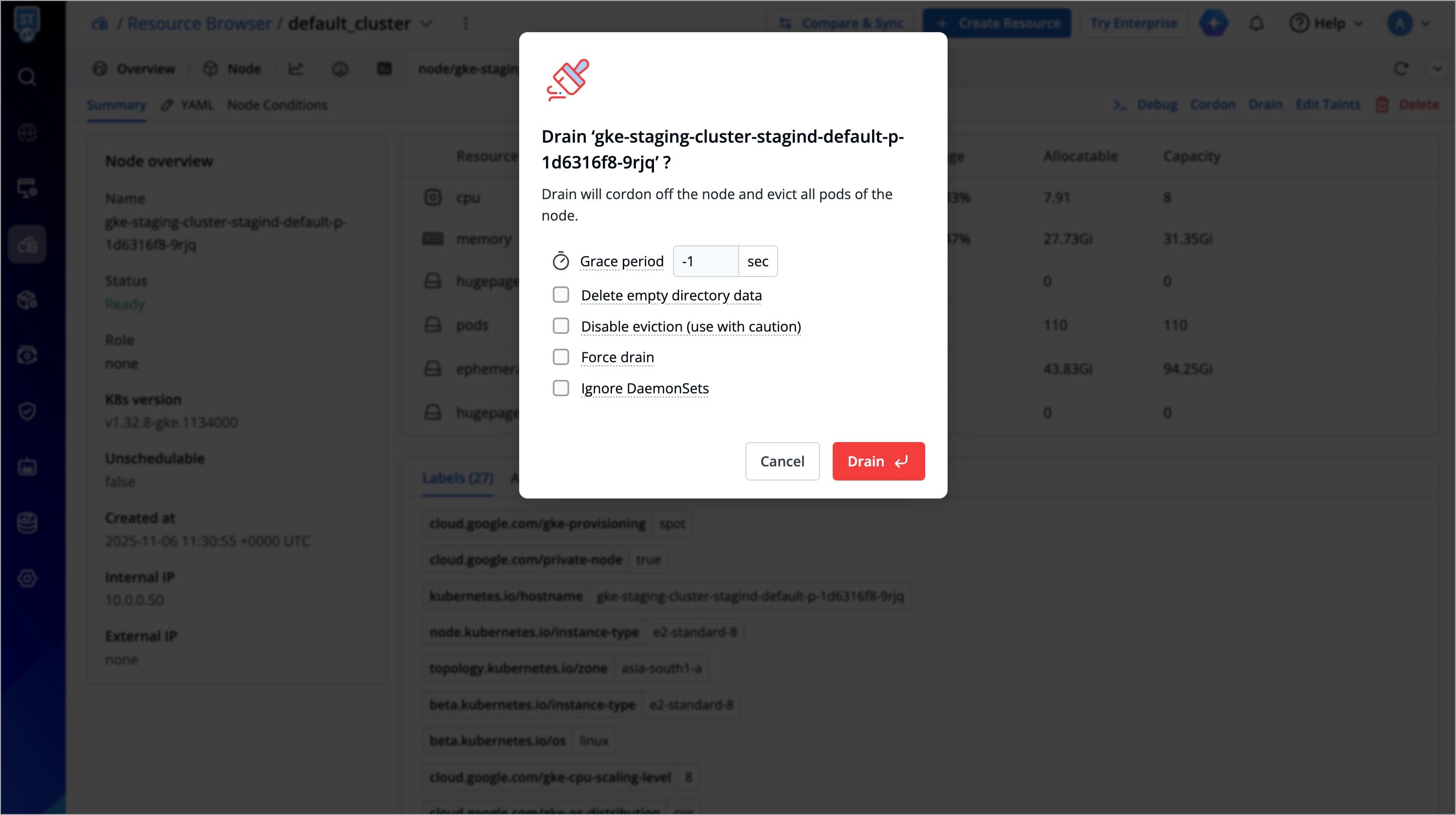 A confirmation dialog box will appear, click Drain Node to proceed.