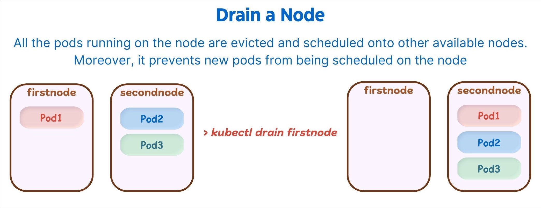 Before performing maintenance on a node, draining a node evicts all of your pods safely from a node. Safe evictions allow the pod’s containers to gracefully terminate and honour the PodDisruptionBudgets you have specified (if relevant).