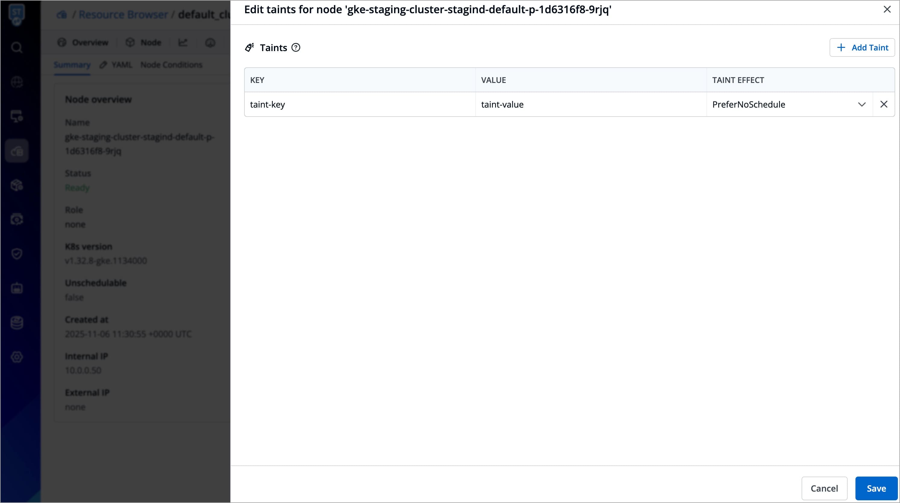 You can also add more taints using + Add taint button, or delete the existing taint by using the delete icon.