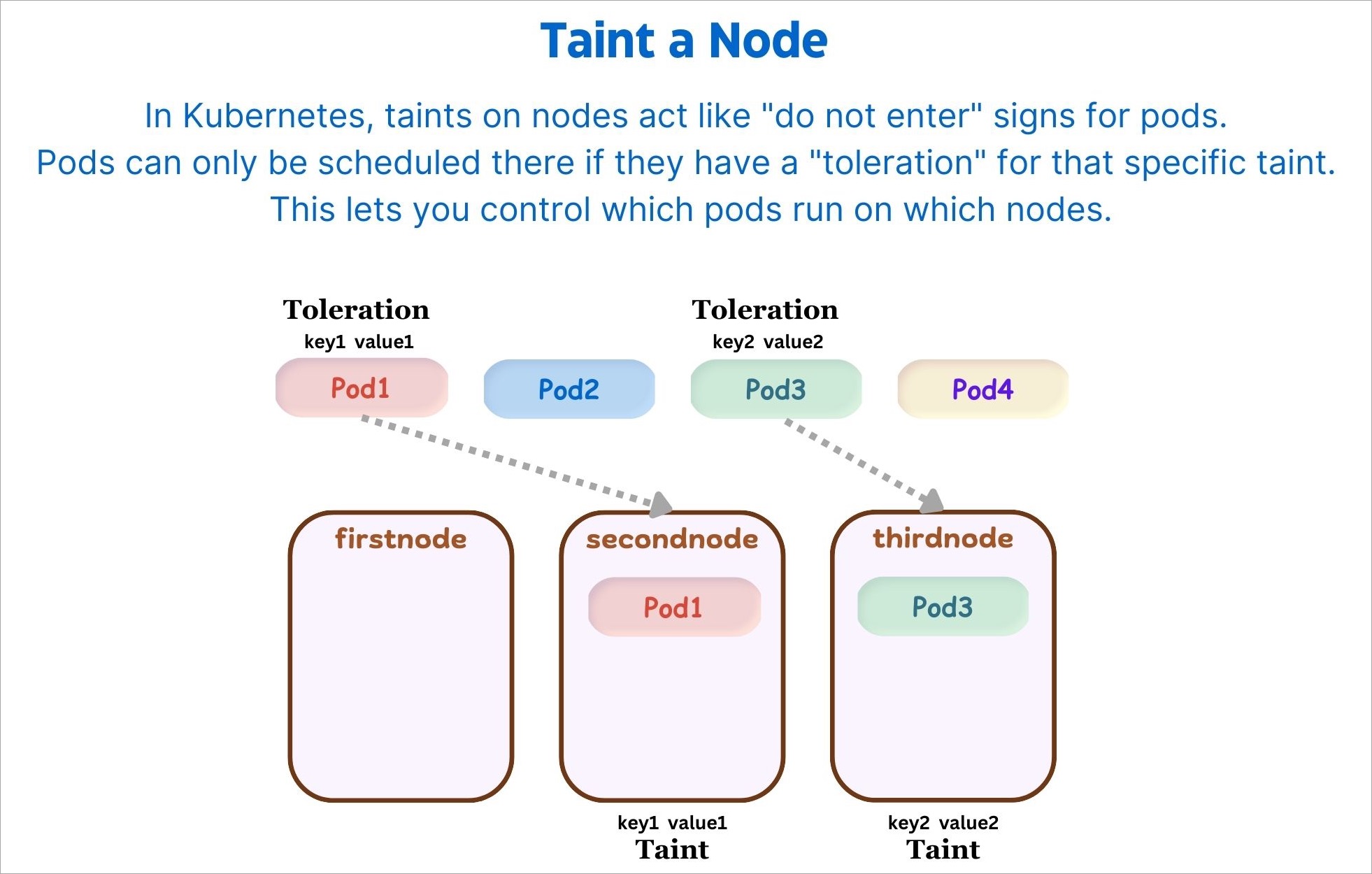 Taints are key:value pairs associated with effect. After you add taints to nodes, you can set tolerations on a pod to allow the pod to be scheduled to nodes with certain taints. When you taint a node, it will repel all the pods except those that have a toleration for that taint. A node can have one or many taints associated with it.