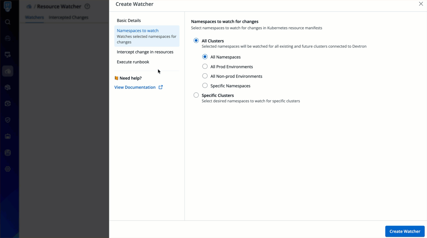 Here, you can select the namespaces whose Kubernetes resource you wish to monitor for changes.