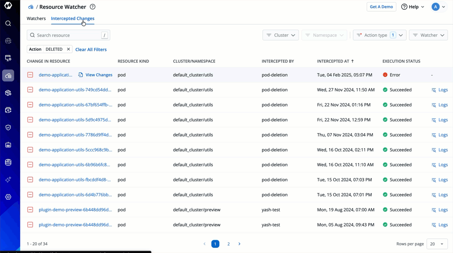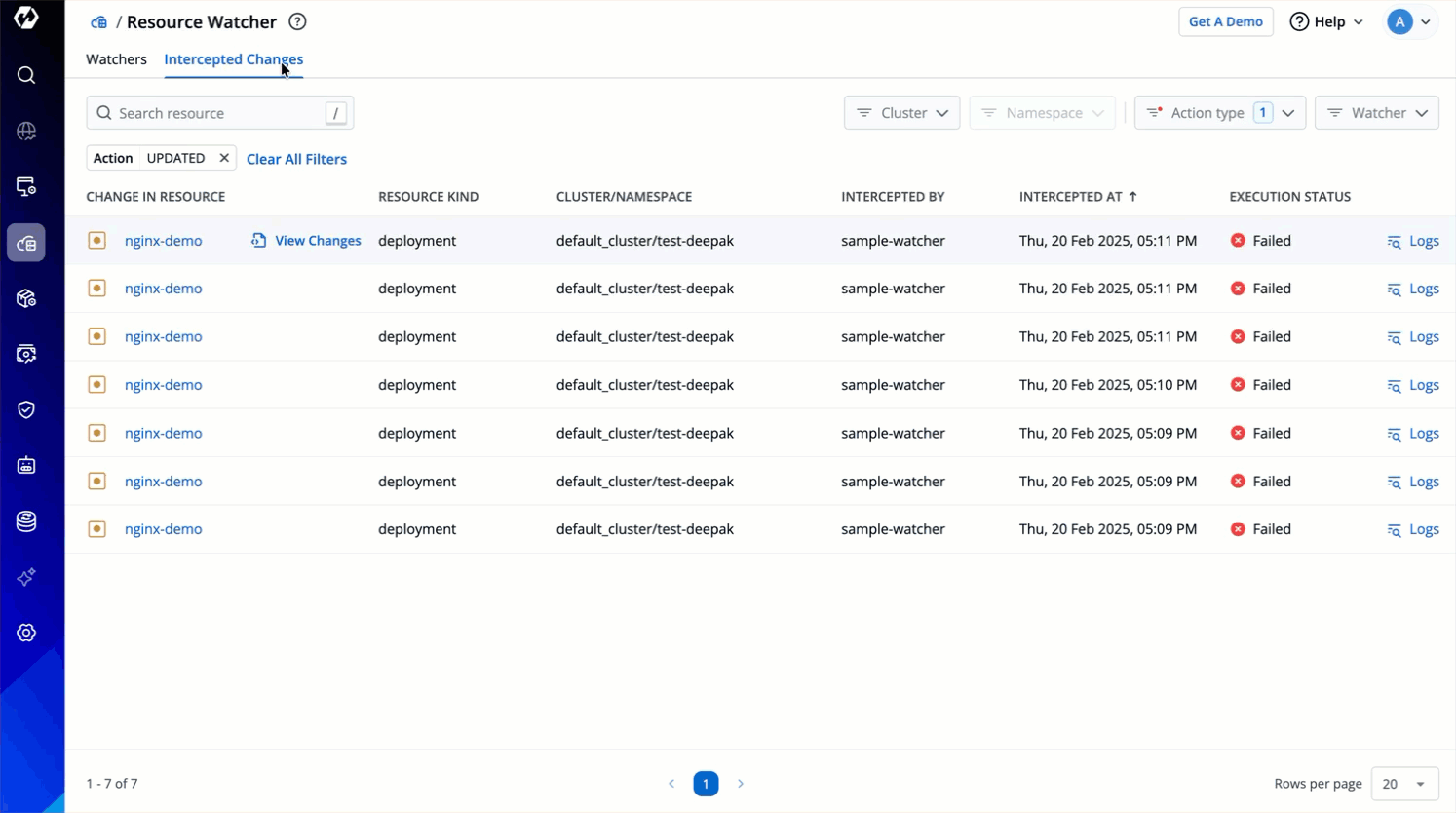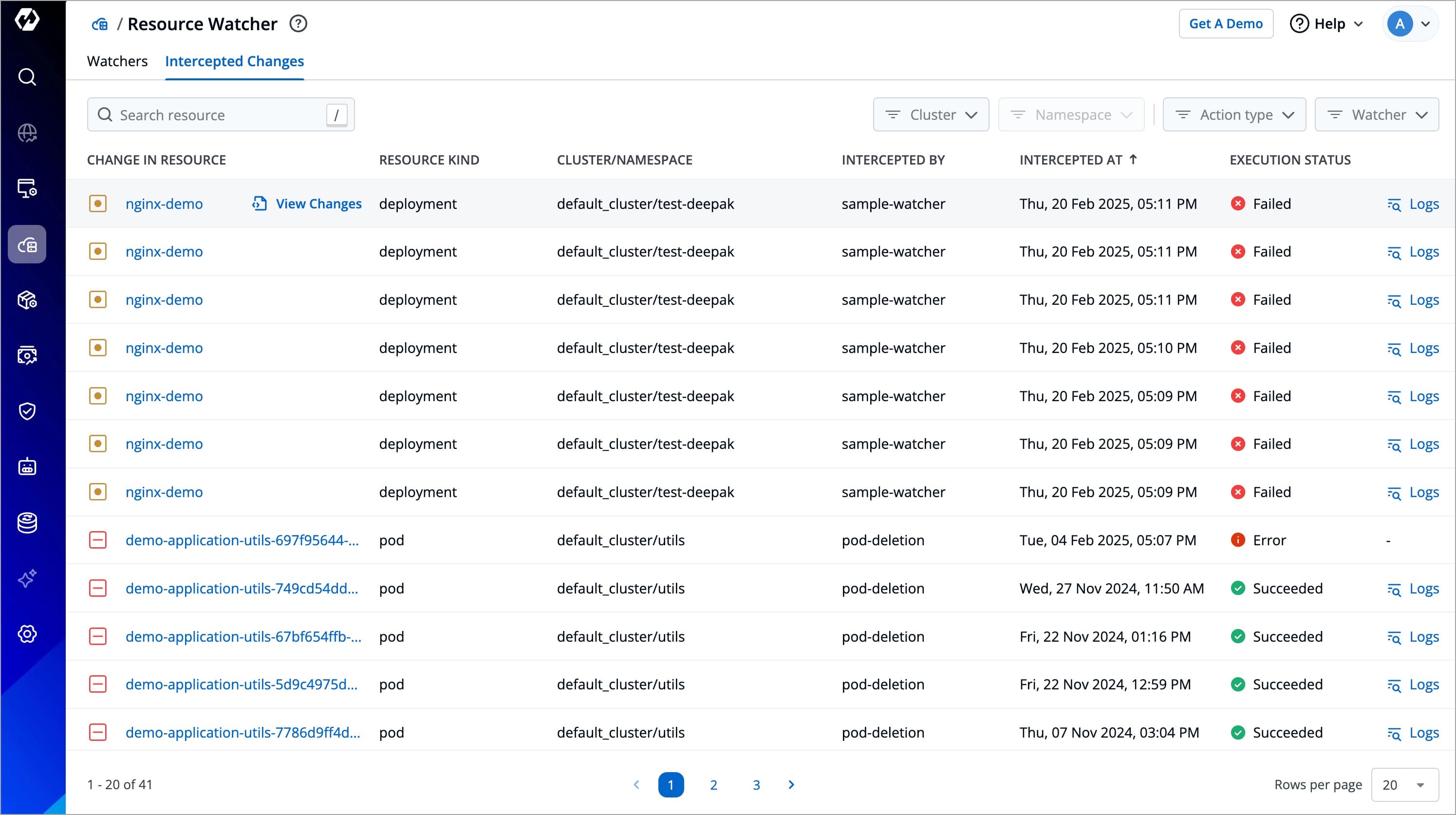 This page allows you to view the changes to Kubernetes resources that you have selected for tracking changes.