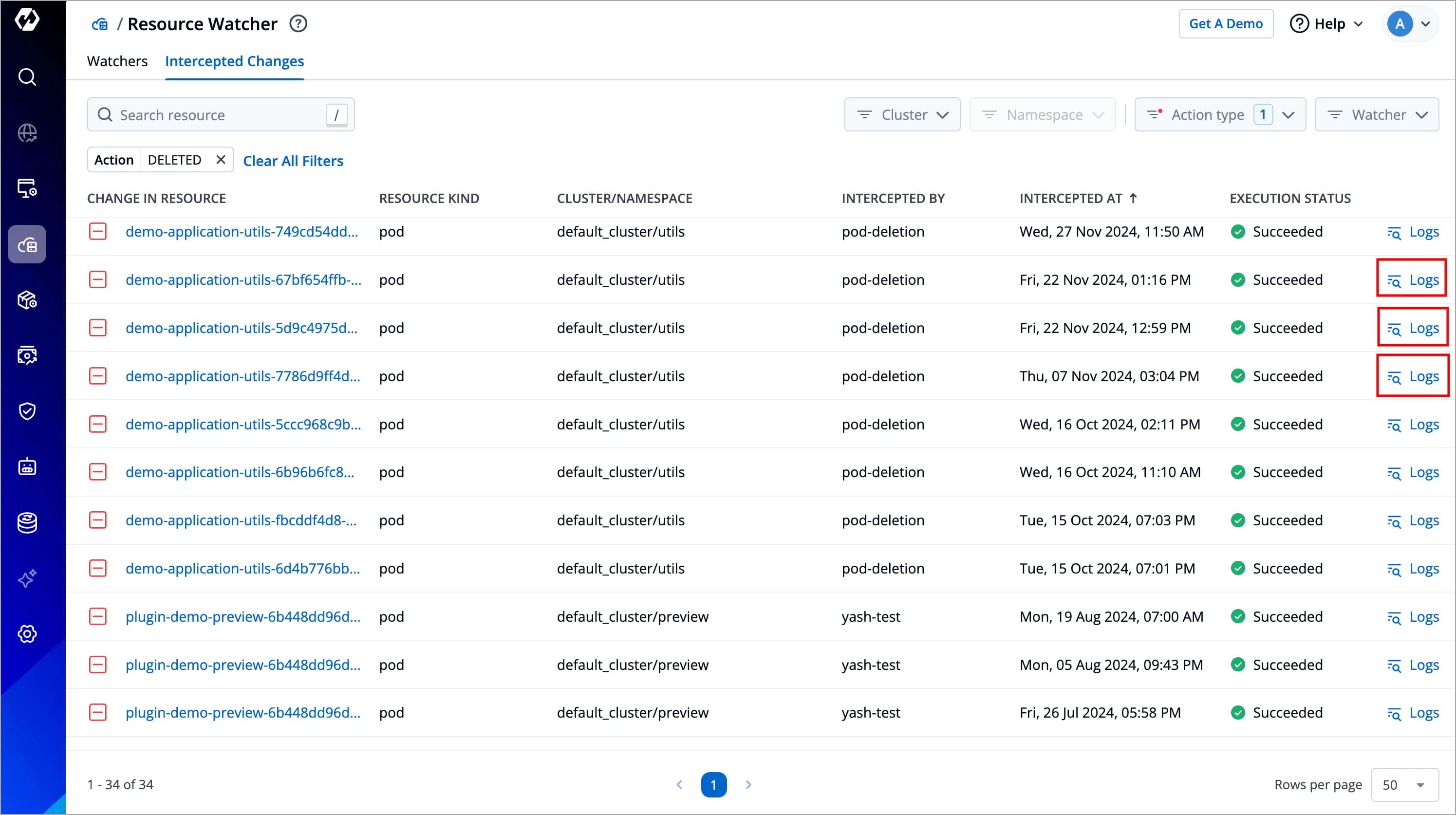 You can check the logs of the job executed when the Resource Watcher intercepts any change by clicking logs.