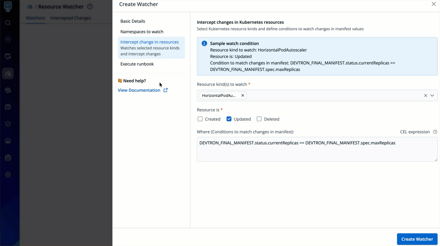 Enter a CEL expression to catch a specific change in the resource's manifest.