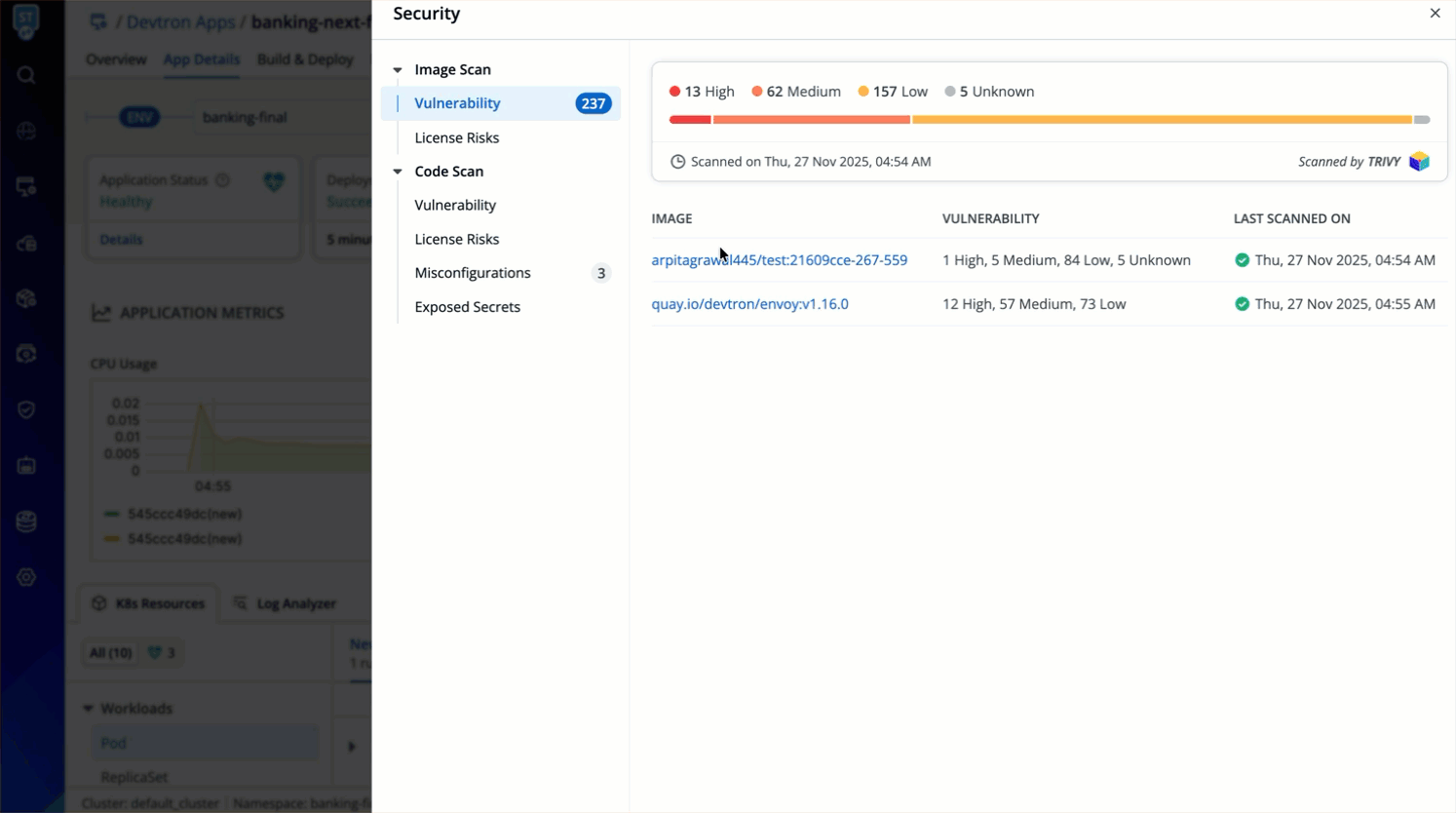 Security Scans - You can view the vulnerabilities detected across your applications.