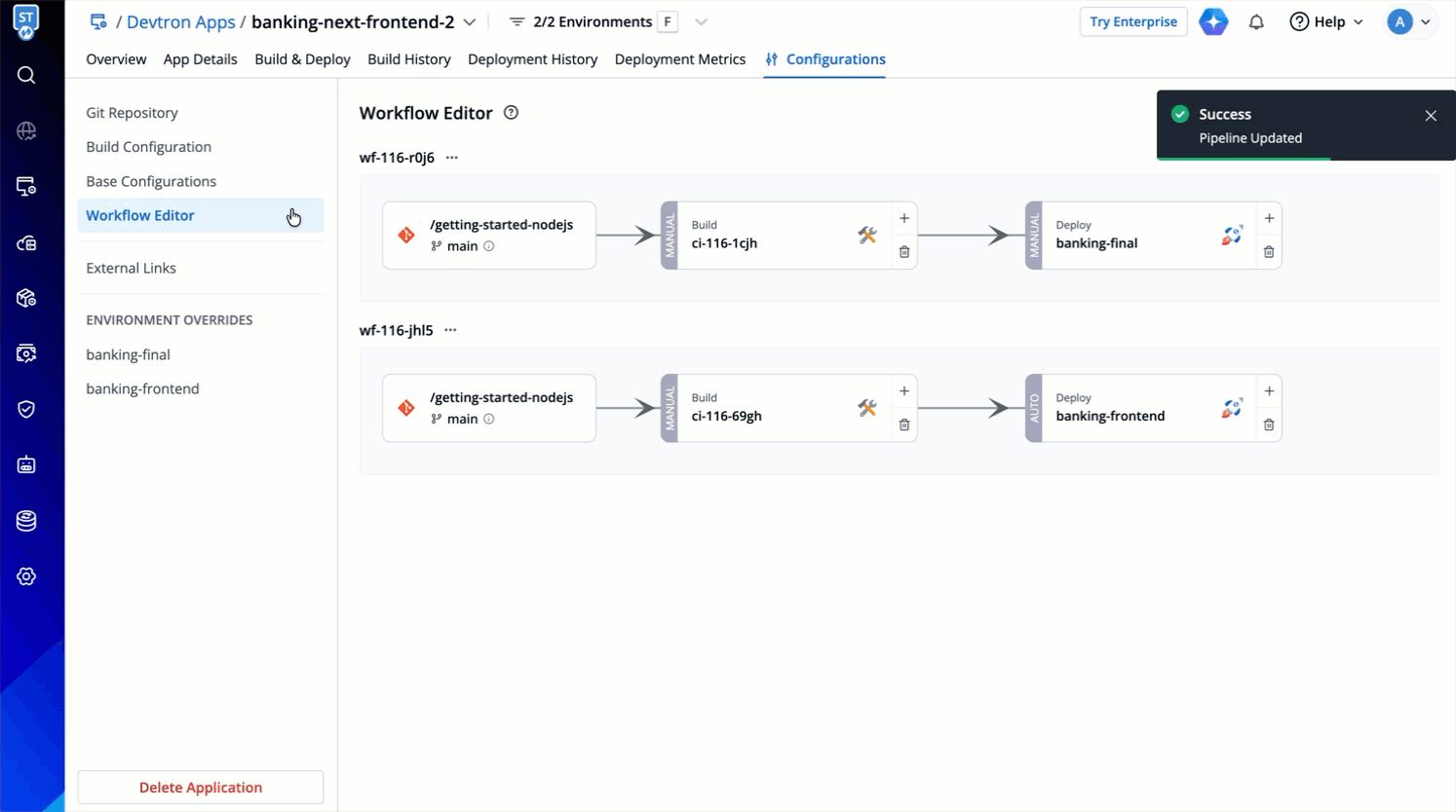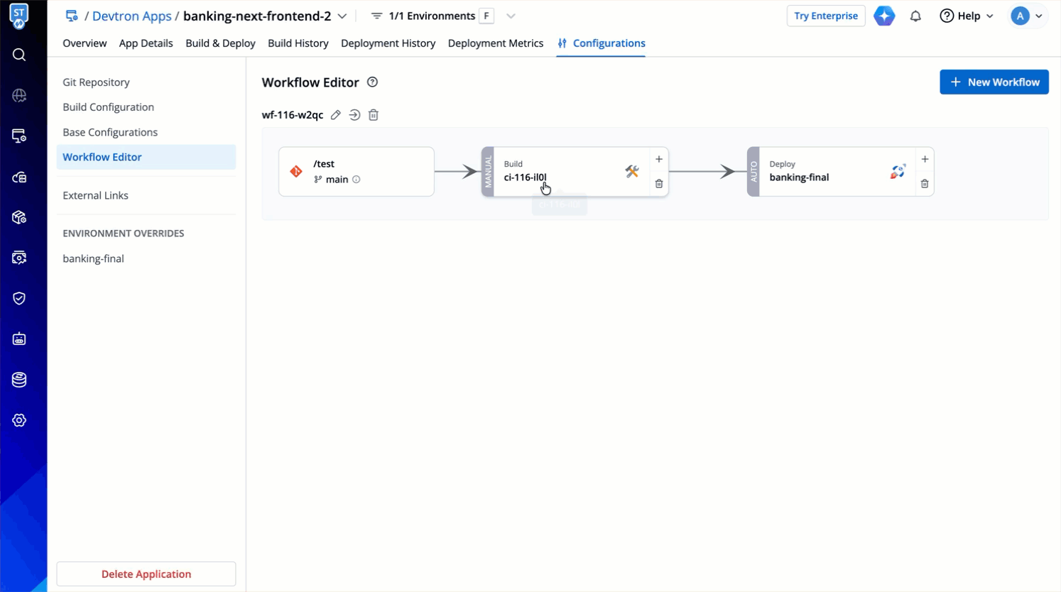 In your Devtron application, go to Configurations (tab) → Workflow Editor.