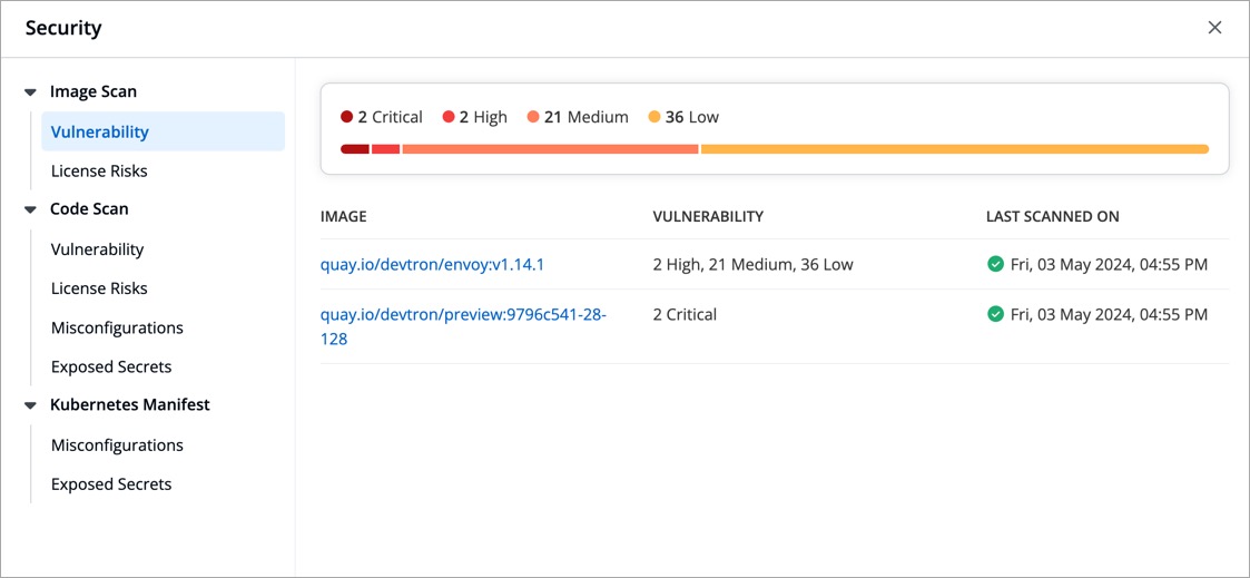 One of the key components of DevSecOps is the detection of security risks. Currently, Devtron supports the following types of scanning: