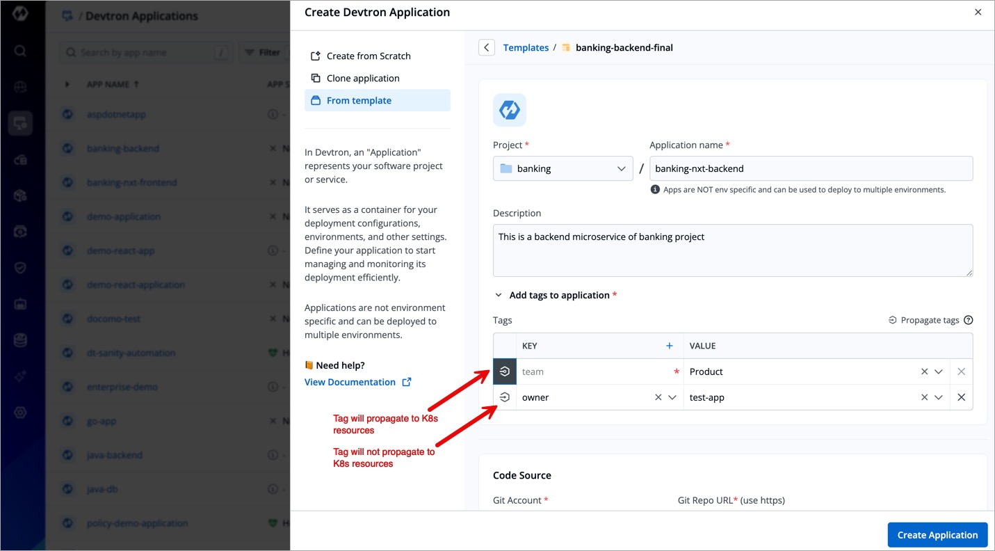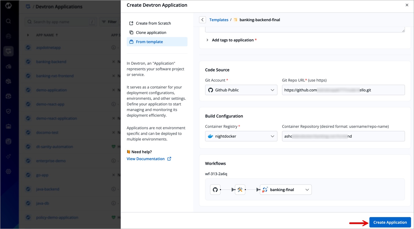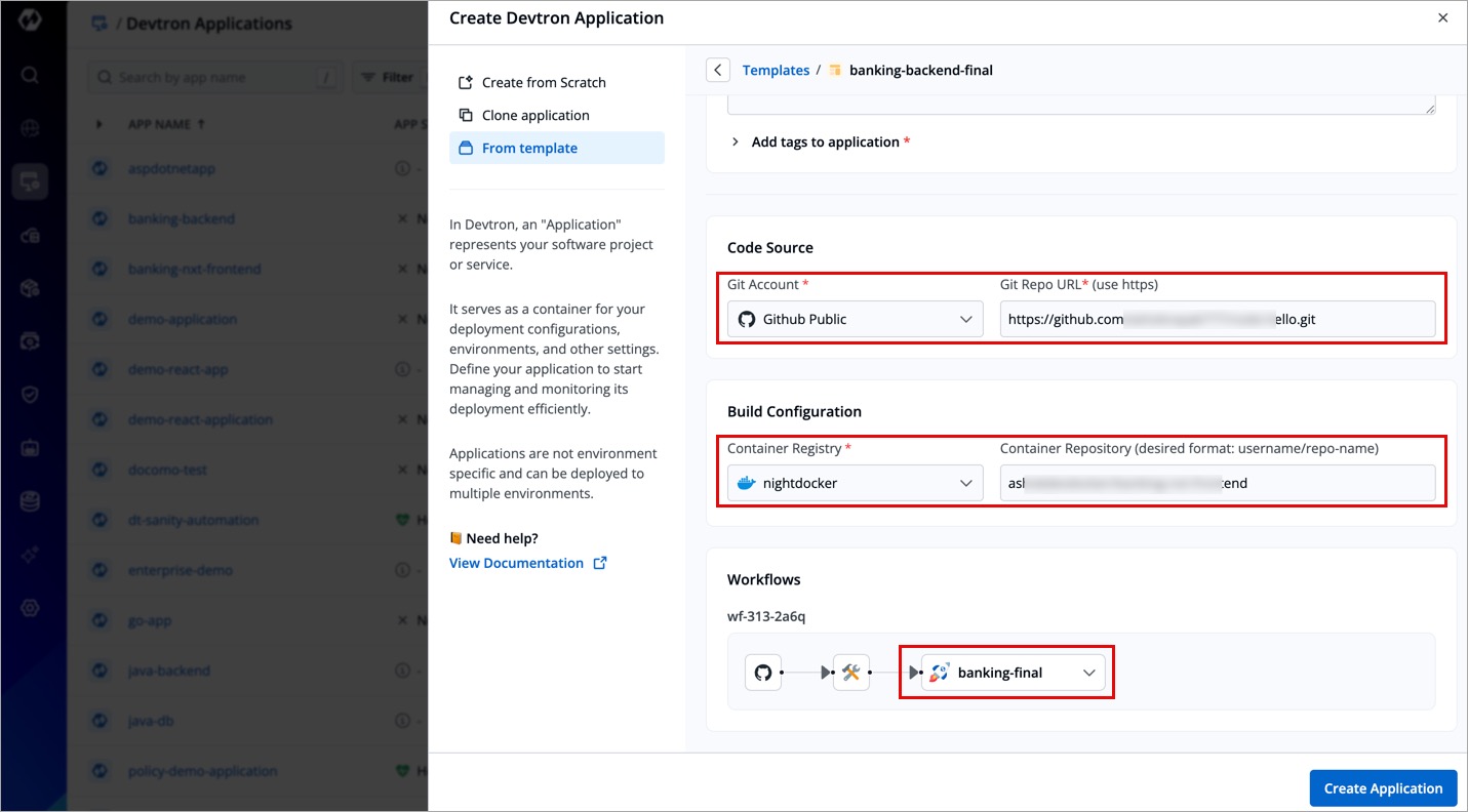 Field Required/Optional Description Project Required Select the Project for your Application Application Name Required Enter a name for the Application Description Optional Provide a short description for the application Tags Optional Key-value pairs used for identifying and organizing the application and can be propagated as Kubernetes labels. To learn more refer Tags section. Git Account Required Select a Git Account Git Repo URL Required Enter the preferred Git Repository Container Registry Required Select a Container Registry Container Repository Optional Enter a container repository; desired format: username/repo-nameWorkflows Optional Select preferred environments for your deployment pipeline in your workflows