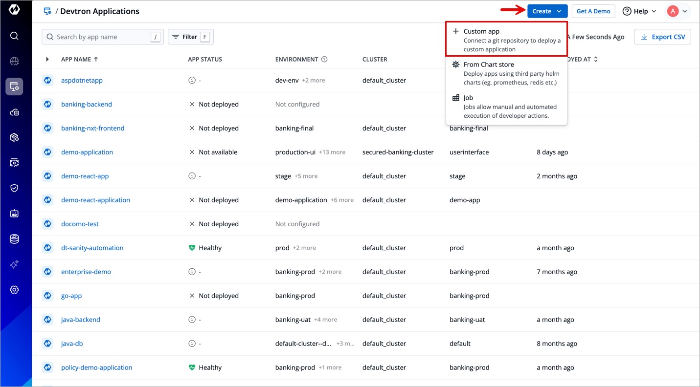 Select Custom app from the drop-down list; a Create Devtron Application modal window will appear.